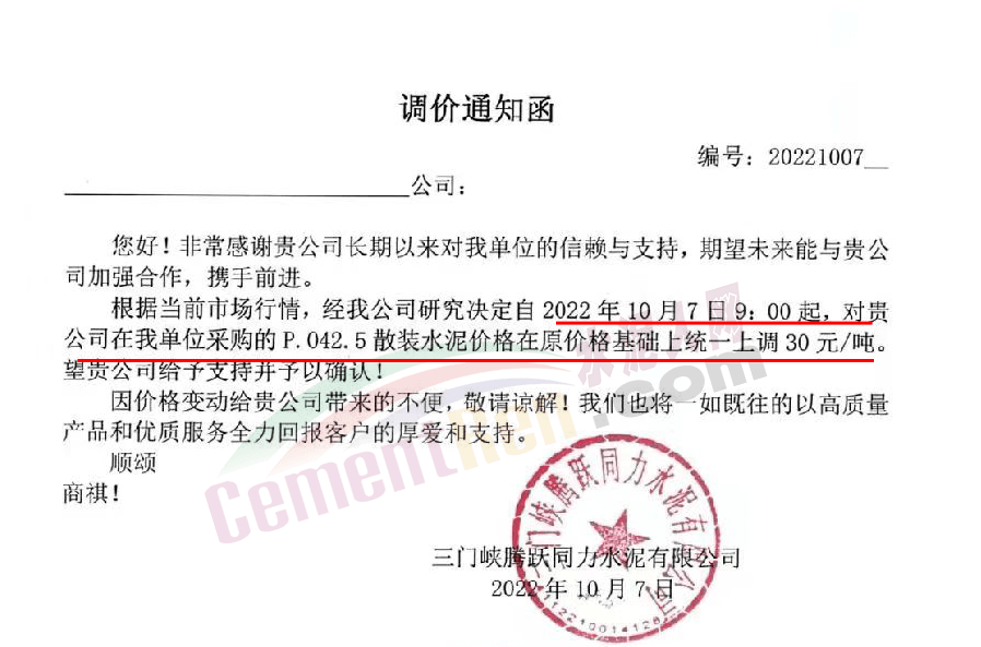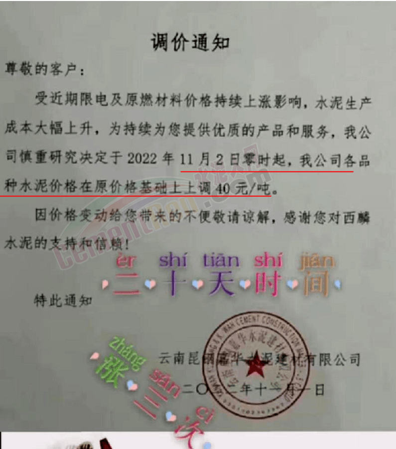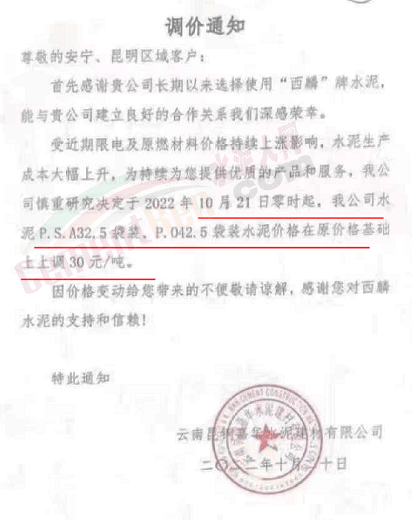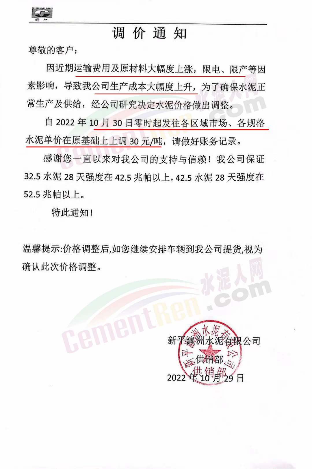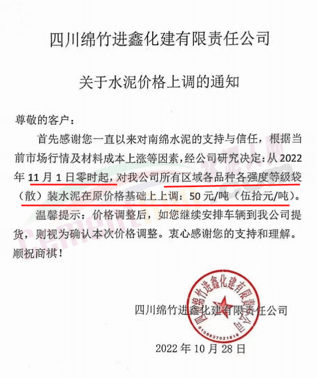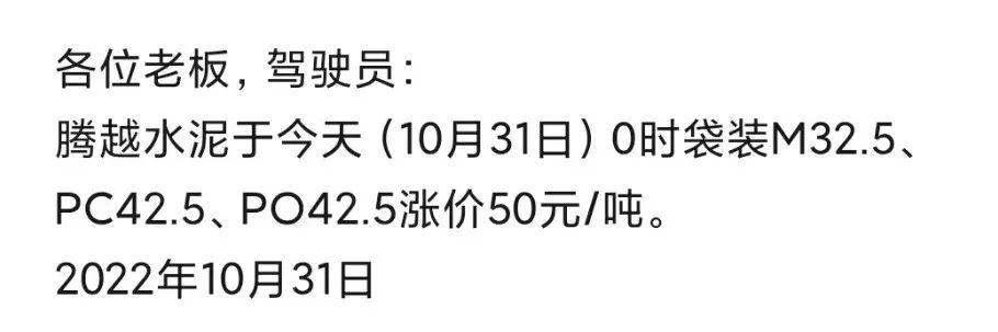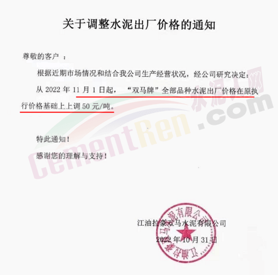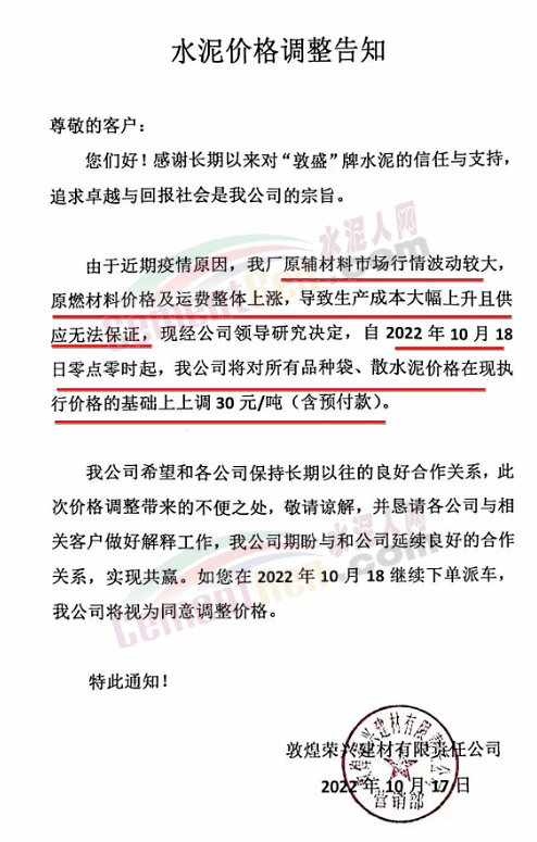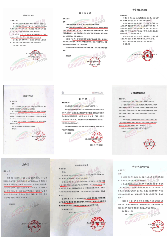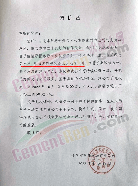 河北沙河市双基水泥有限公司通知,由于疫情原因各原材料供应不足、价格持续上涨,造成公司生产、销售等环节的成本大幅度上升,经公司研究决定自2022年10月12日起,上调50元/吨。
