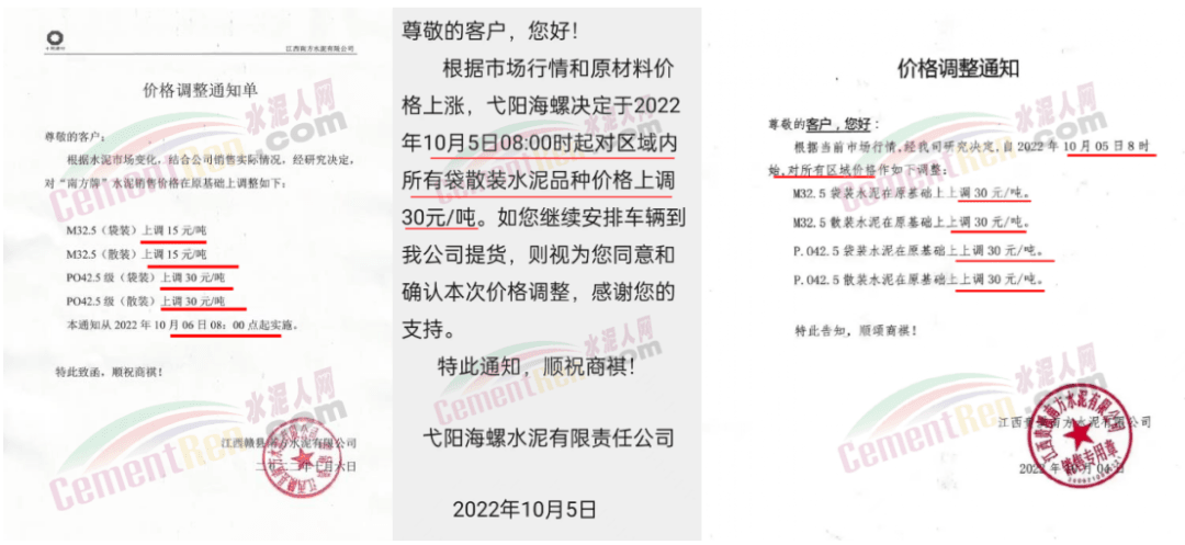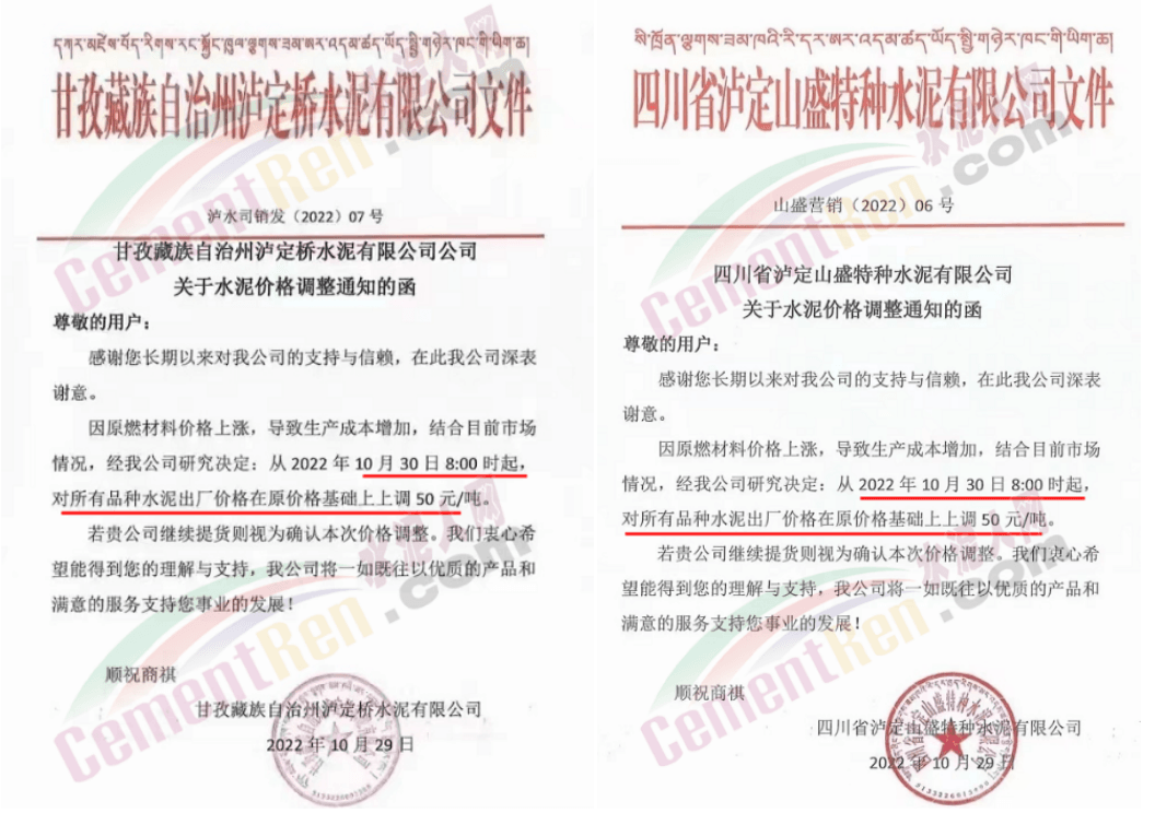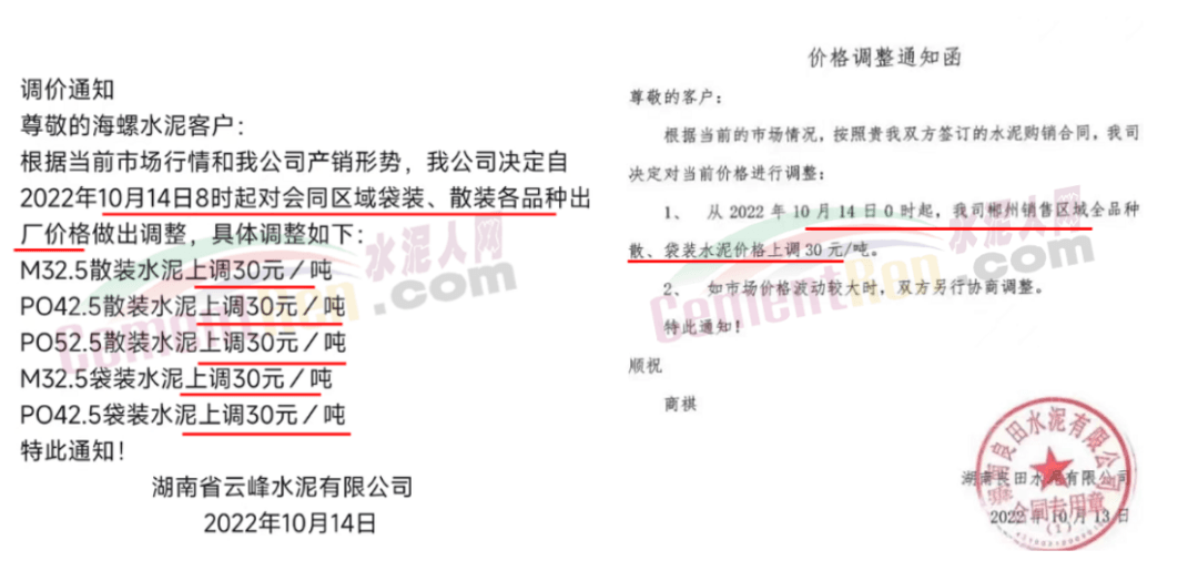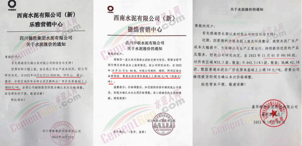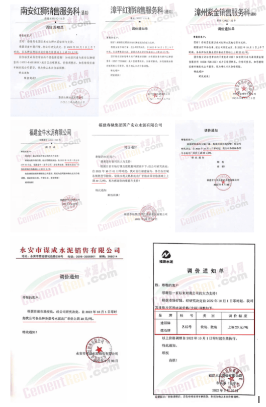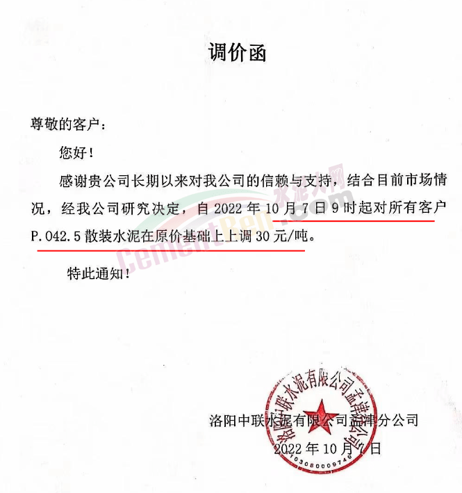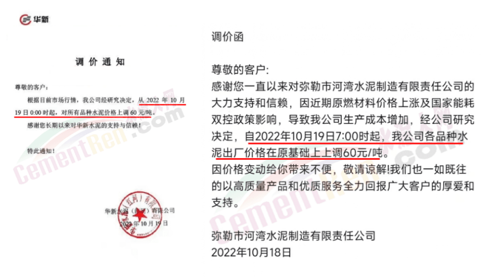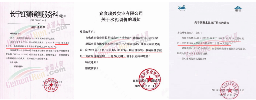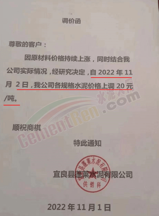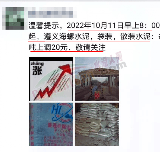 河北沙河市双基水泥有限公司通知,由于疫情原因各原材料供应不足、价格持续上涨,造成公司生产、销售等环节的成本大幅度上升,经公司研究决定自2022年10月12日起,上调50元/吨。