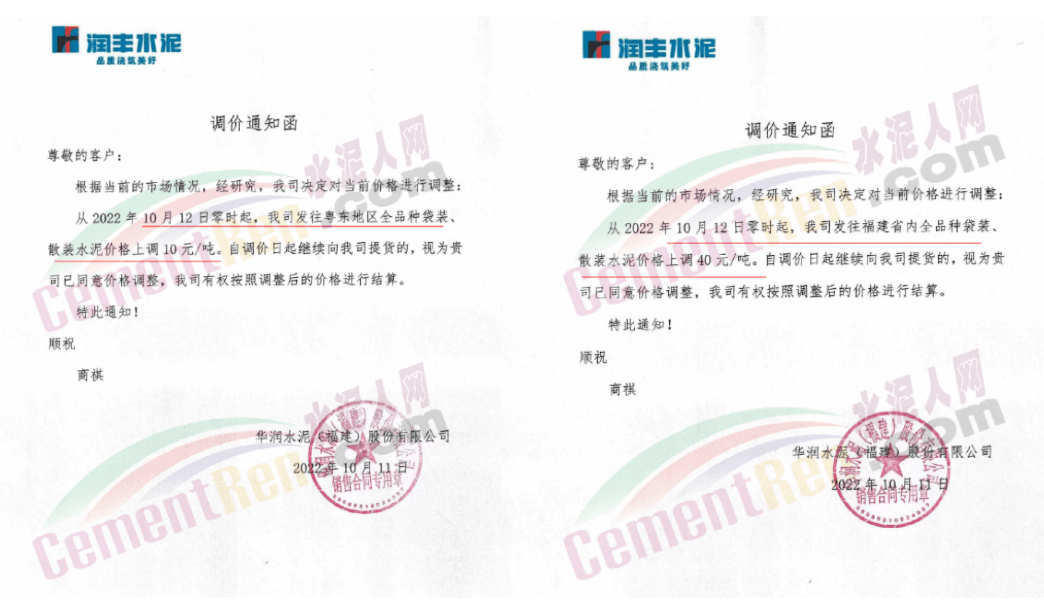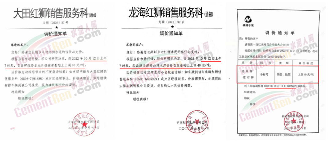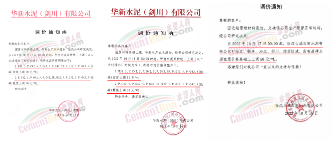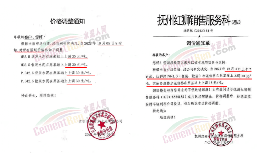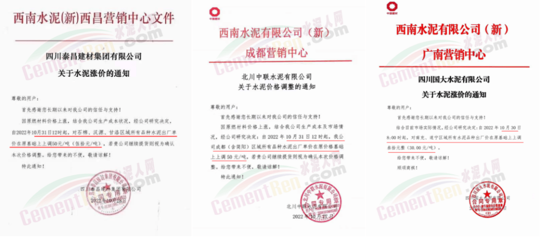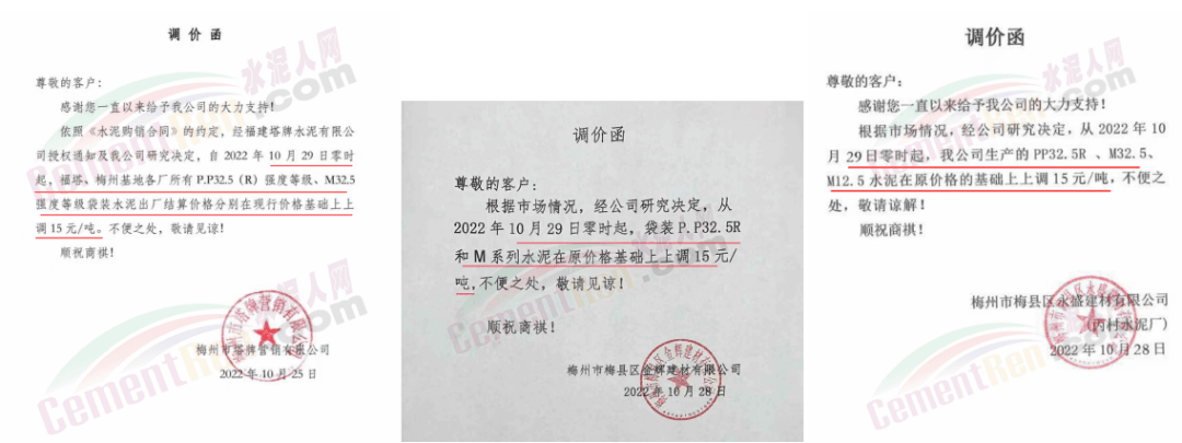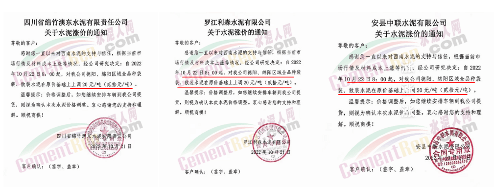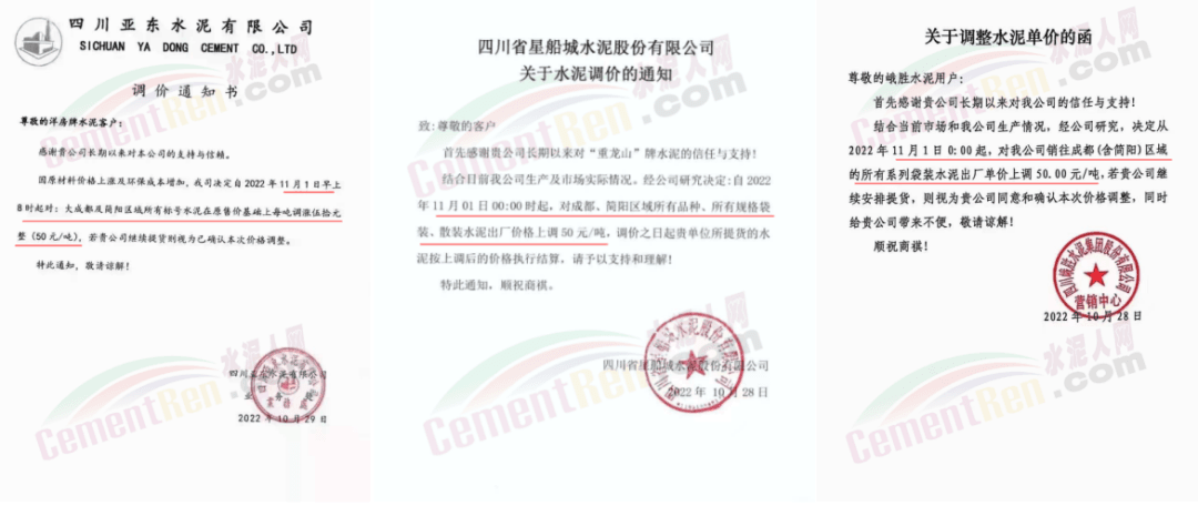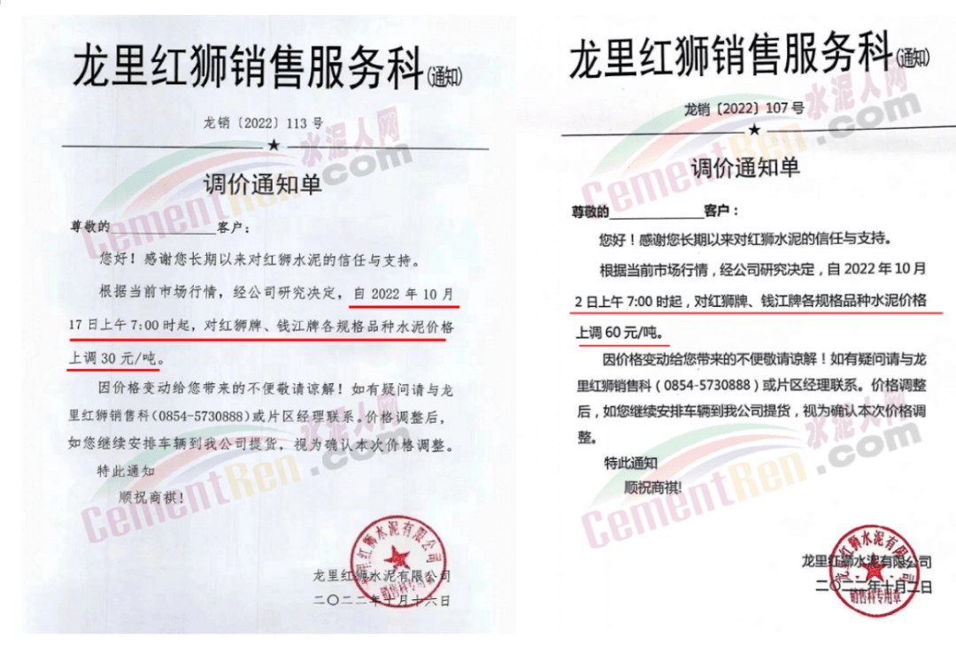 河北沙河市双基水泥有限公司通知,由于疫情原因各原材料供应不足、价格持续上涨,造成公司生产、销售等环节的成本大幅度上升,经公司研究决定自2022年10月12日起,上调50元/吨。