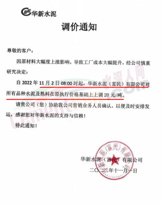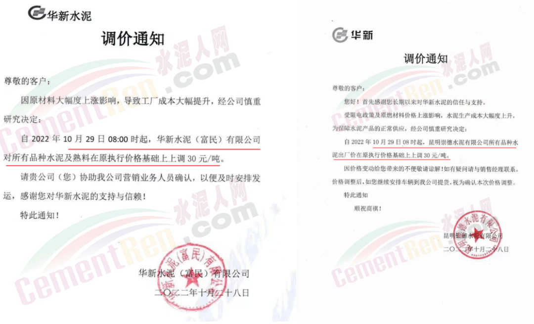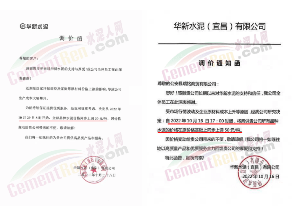 湖北华新水泥襄阳公司通知10月29日上调30元/吨,10月中旬,华新宜昌公司通知10月16日上调水泥价格50元/吨。
