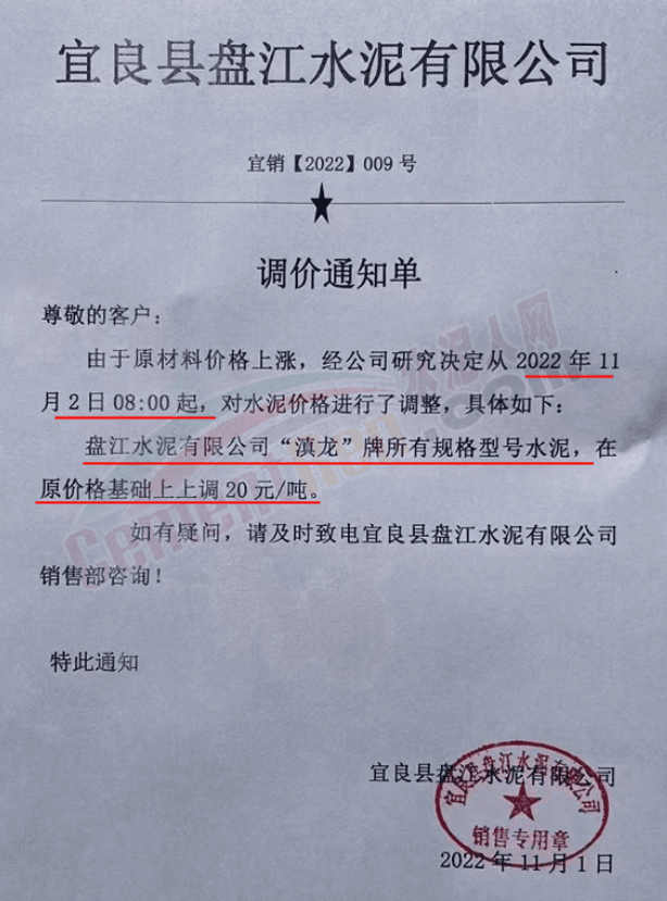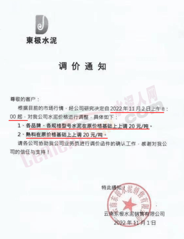 日前,云南区域华新水泥富民公司、云南东极水泥、宜良蓬莱水泥、宜良盘江水泥通知11月2日起,上调水泥及熟料价格20元/吨。