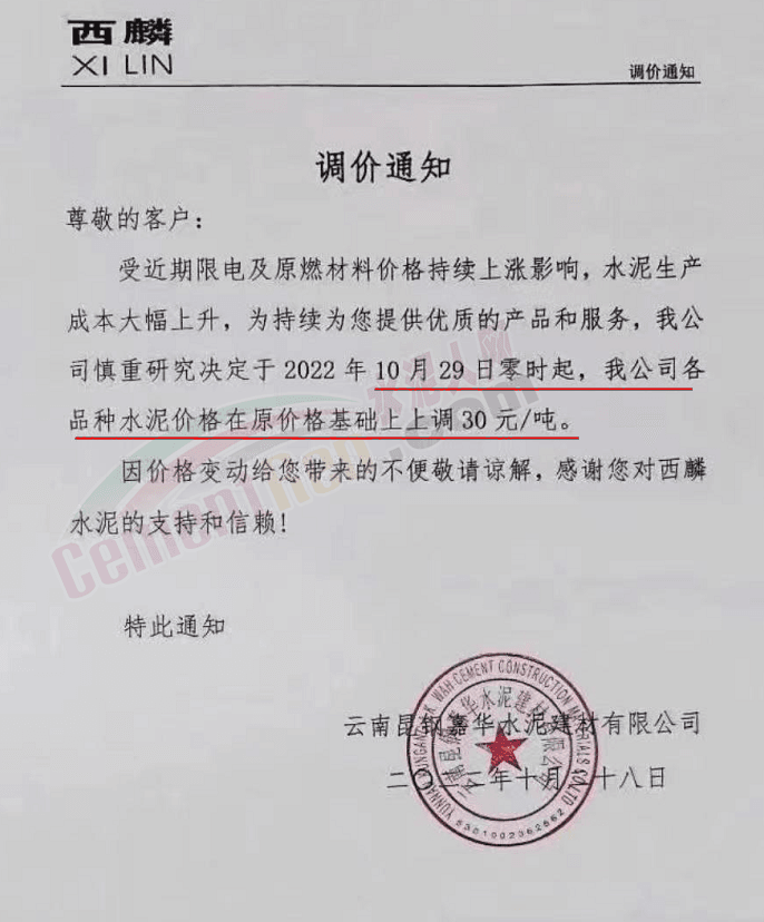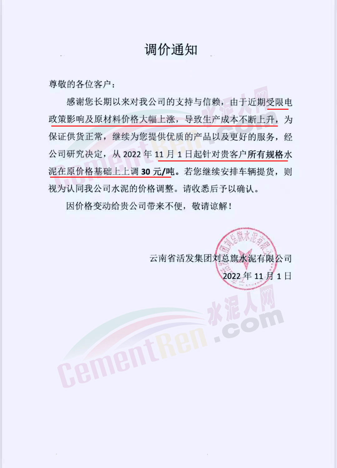 云南省活发集团刘总旗水泥有限公司通知,受限电政策影响及原材料价格大幅上涨,导致生产成本不断上升,水泥价格自11月1日起上调30元/吨。