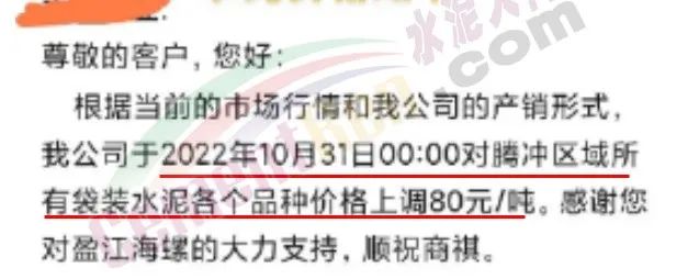 云南德宏盈江海螺通知,10月31日0时起,对腾冲区域所有袋装水泥上调80元/吨,保山海螺水泥所有品种水泥上调50元/吨。