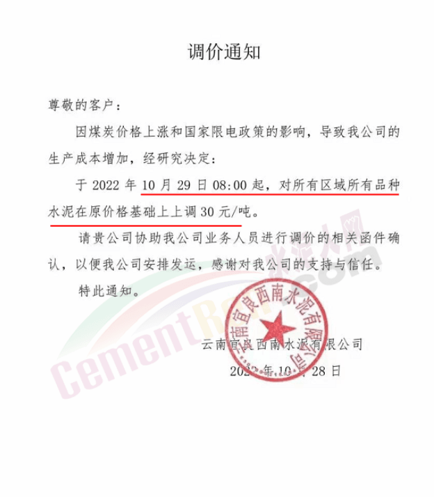 宜良西南水泥、新平瀛洲水泥有限公司通知10月30日起水泥价格上调30元/吨。