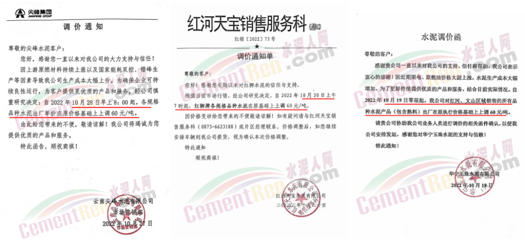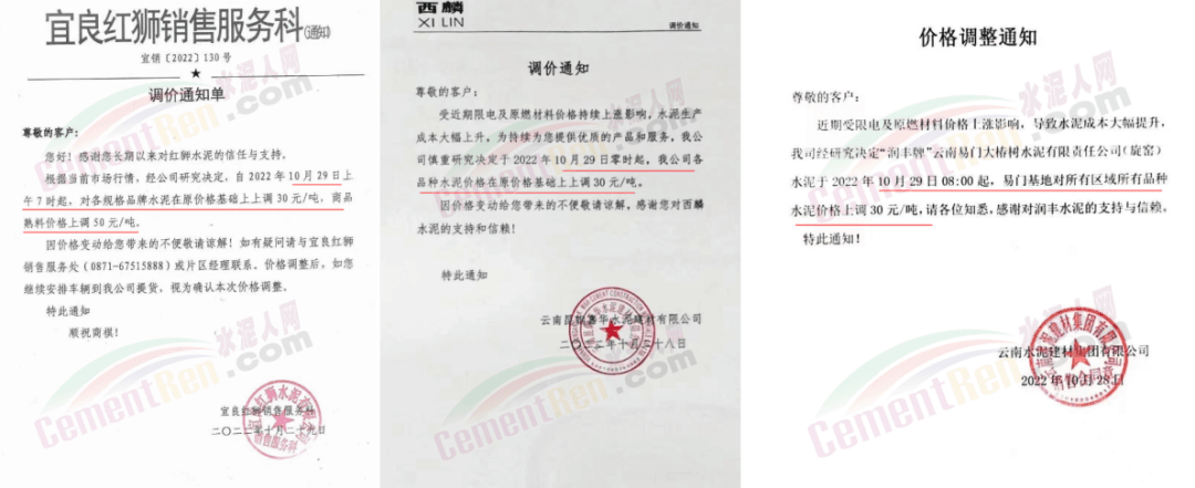 据了解,10月30日前后,云南区域海螺水泥、西南水泥、红狮水泥、昆钢嘉华、云南水泥建材集团、华新水泥、尖峰集团等多家企业也曾通知水泥价格上调30-80元/吨,部分企业熟料报价同步上调60元/吨。