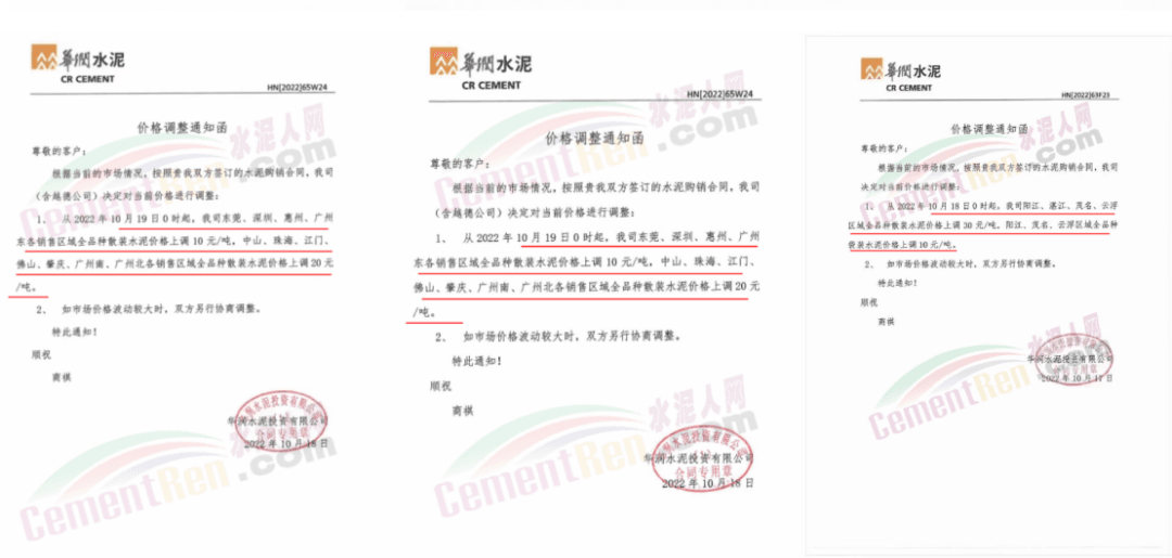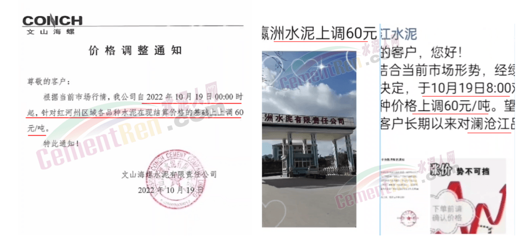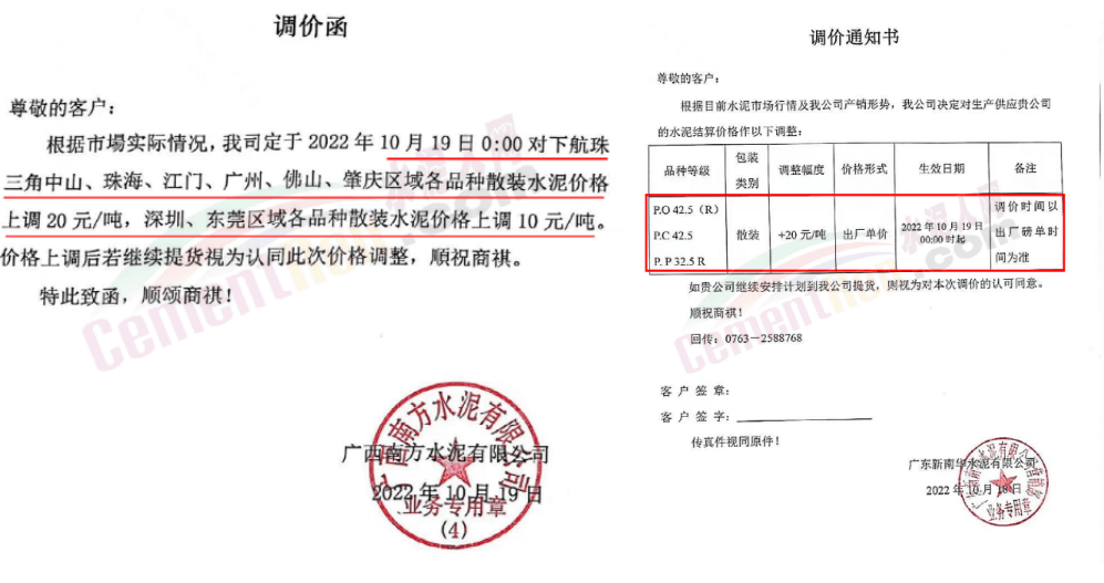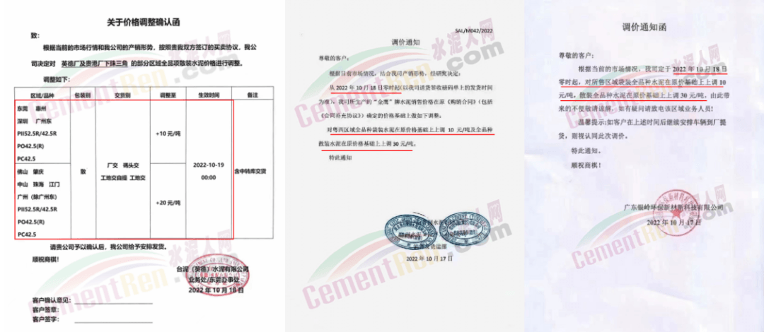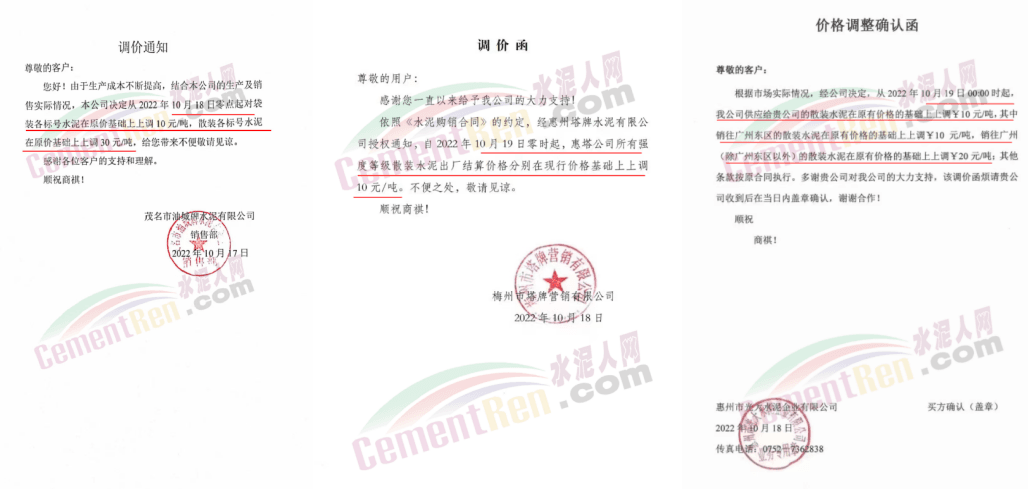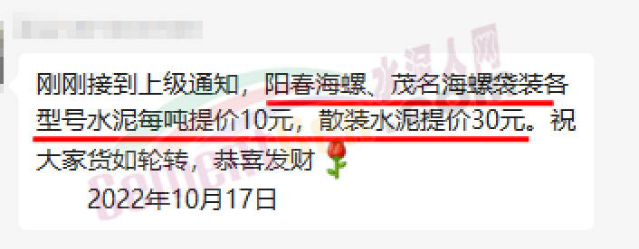 10月19日前后,珠三角区域海螺水泥、中材天山、中材亨达、华润水泥、台泥水泥、塔牌水泥、光大水泥、青洲水泥等水泥企业通知上调水泥价格10-30元/吨,下游商混企业纷纷跟进。