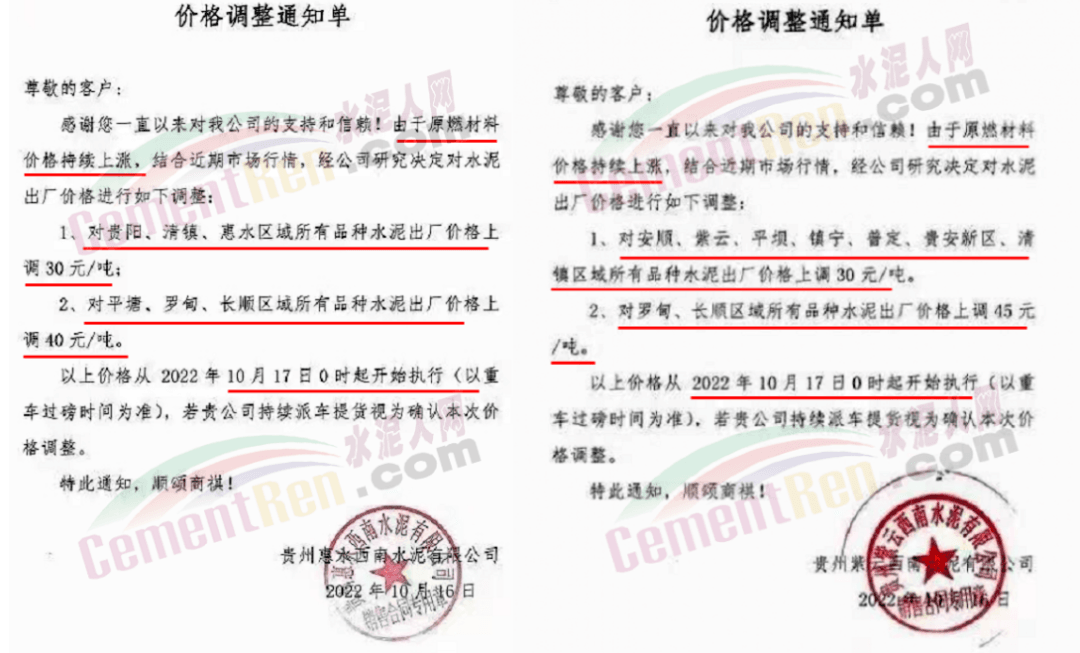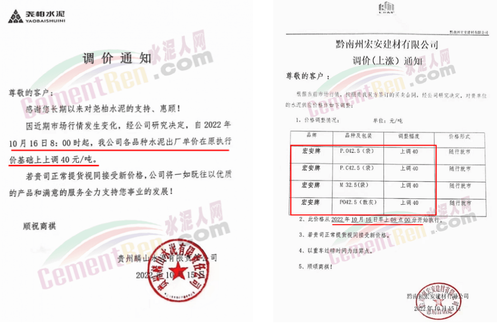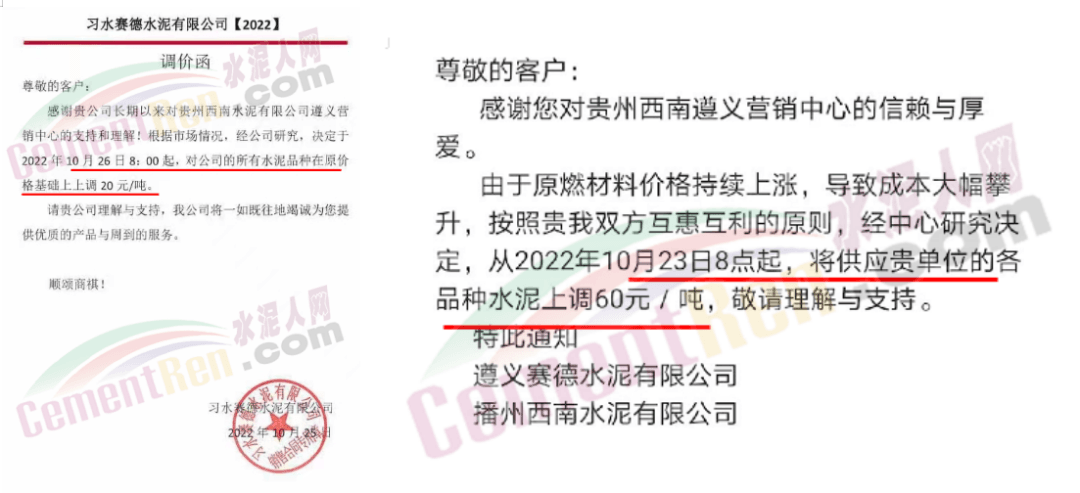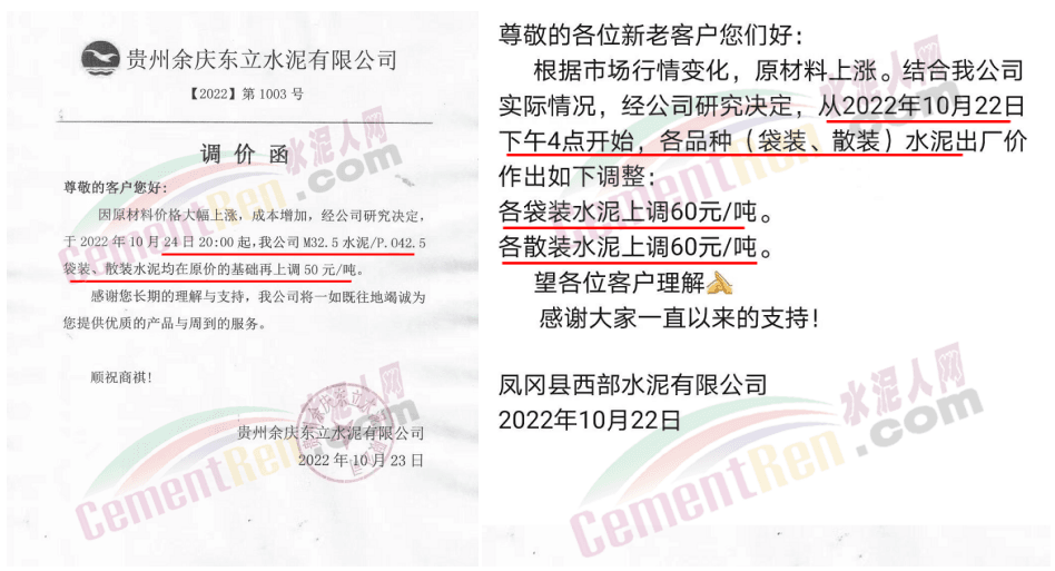 贵州区域西南水泥、东立水泥、西部水泥等企业23日前后上调水泥价格20-60元/吨。区域内主要品牌企业西南、红狮、尧柏等曾于10月16日前后上调水泥价格20-40元/吨,两次累计上调40-100元/吨;龙里红狮曾于10月初一次性上调水泥价格60元/吨,10月17日再次上调30元/吨,月内累计上调超100元/吨。