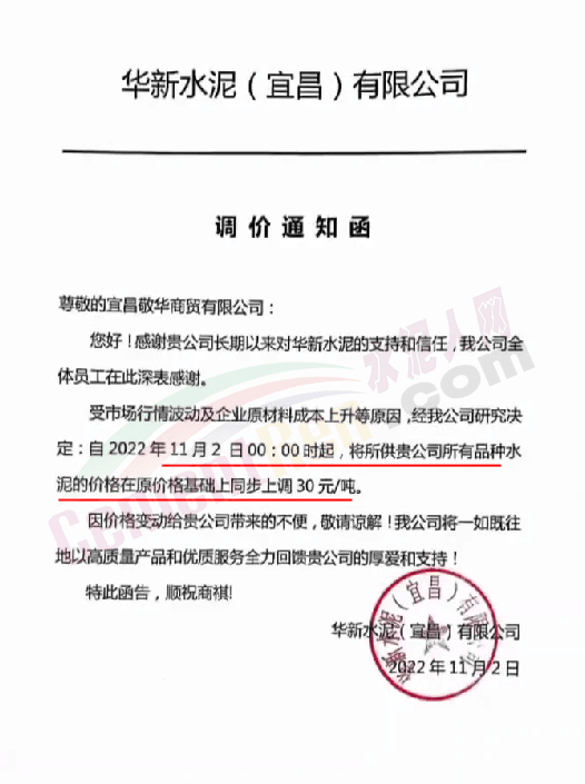华新水泥宜昌公司通知11月2日0时起上调水泥价格30元/吨,企业曾于10月16日上调水泥价格50元/吨,两次累计上调80元/吨。