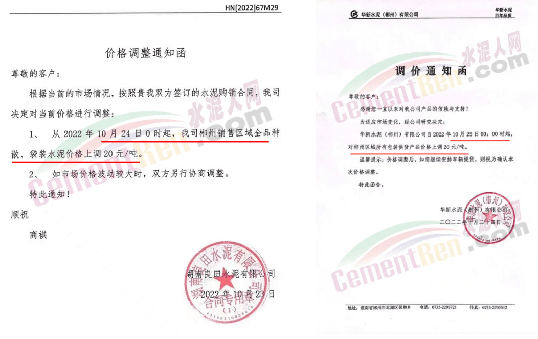 湖南华润良田水泥、华新水泥等通知10月24日起上调水泥价格20元/吨。区域内主要品牌企业华润良田、双峰海螺、云峰水泥、红狮水泥旗下康达湖南都曾于10月中旬通知上调水泥价格30元/吨,两次累计上调50元/吨。