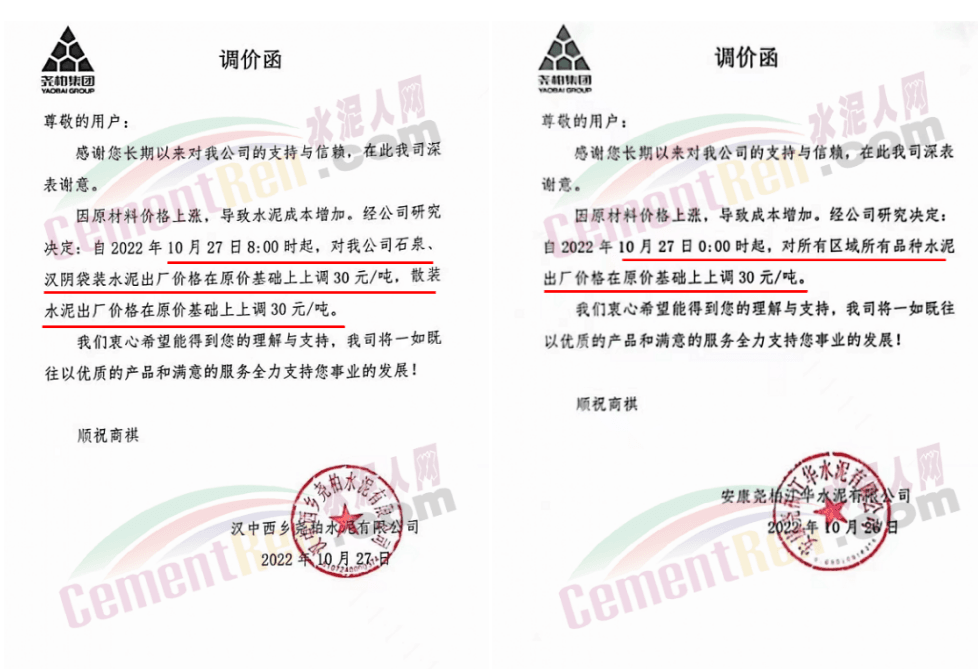 汉中主要品牌企业,中材汉江水泥、汉中尧柏水泥有限公司曾通知自10月1日起,对汉中区域所有袋装品种水泥价格上调20元/吨。