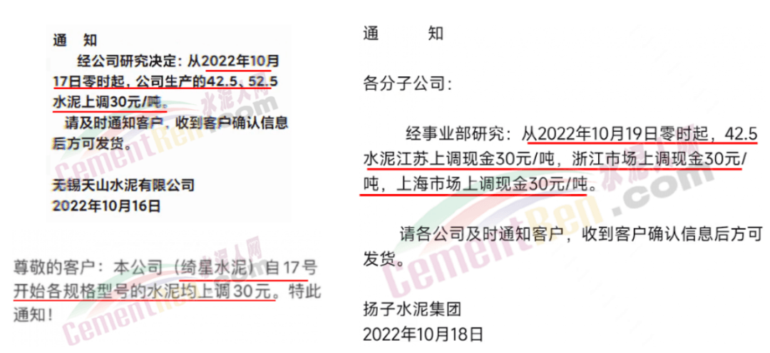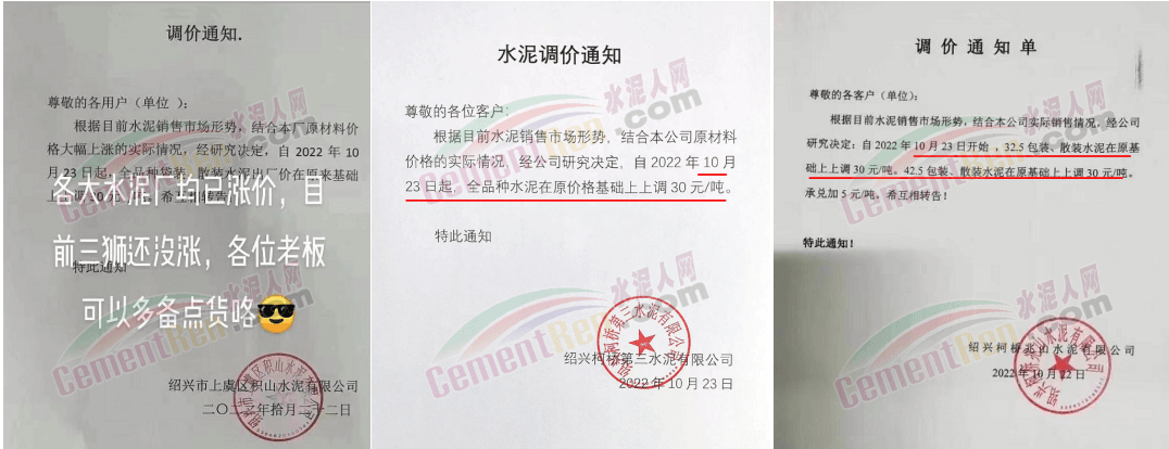 10月20日前后浙江杭州、绍兴区域水泥企业通知上调水泥价格30元/吨。