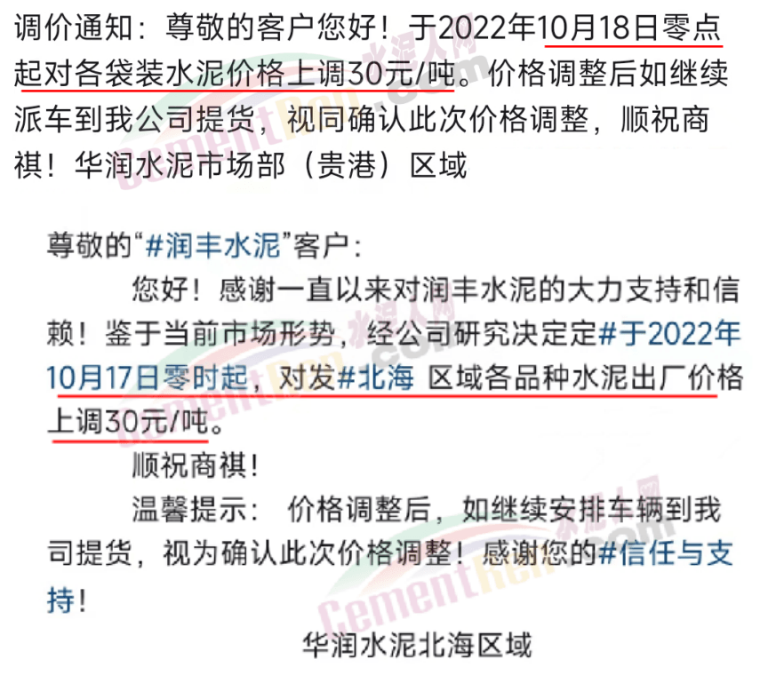 广西华润、海螺、南方、红狮等多家企业通知上调水泥价格30元/吨