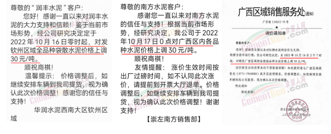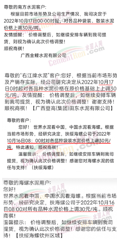 广西区域华润、海螺、南方、红狮等主要品牌企业10月15日于前后通知上调水泥价格30元/吨