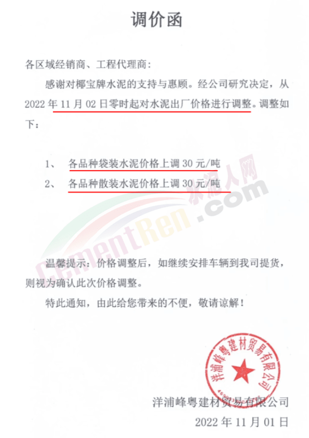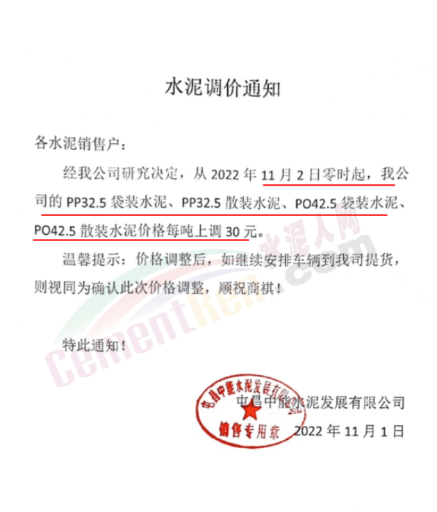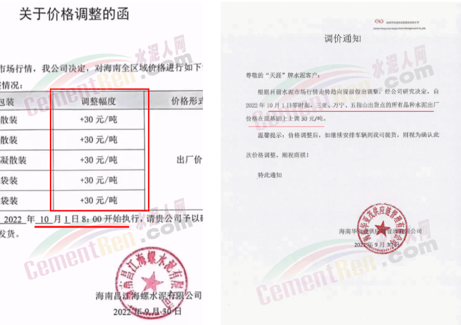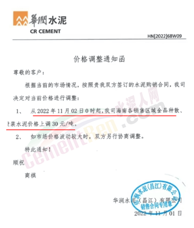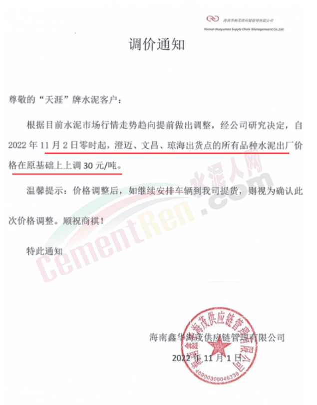 海南华裕茂供应链管理有限公司通知,自2022年11月2日零时起,澄迈、文昌、琼海、儋州、昌江、三亚、万宁、五指山出货点的所有品种水泥出厂价格在原基础上上调30元/吨,从昌江出货的商品熟料出厂价格在原基础上上调15元/吨。