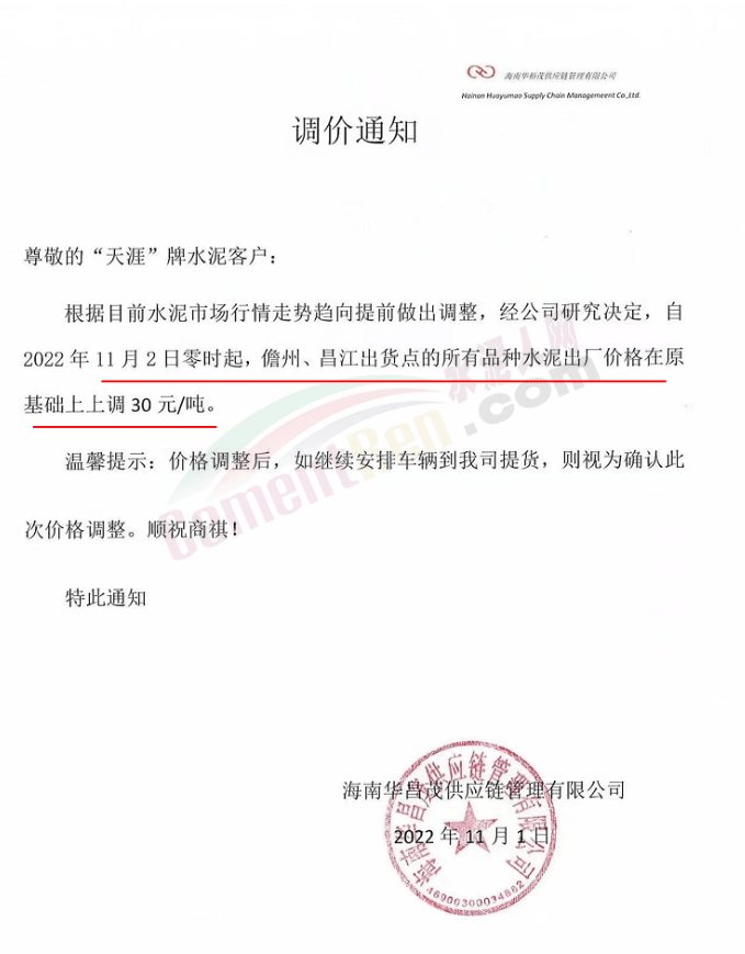海南鑫华海茂从应链管理有限公司通知,11月2日零时起,澄迈、文昌、琼海出货点水泥出厂价上调30元/吨。