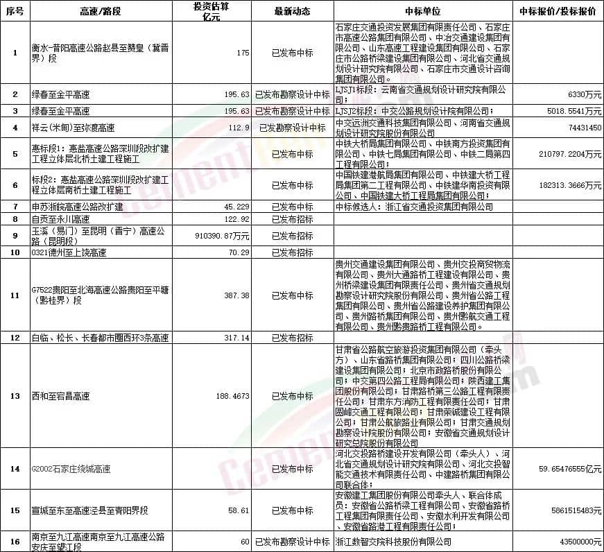 据水泥人网不完全统计,近期已发中标或招标信息的16条重点高速总投资1929.19亿元;