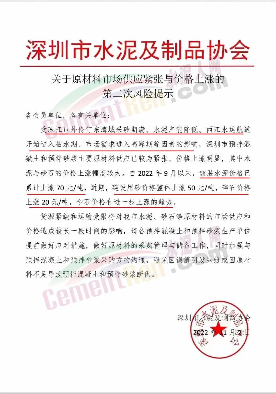 11月2日深圳市水泥及制品协会发布《关于原材料市场供应紧张与价格上涨的第二次风险提示》称,受采砂期满、水泥产能降低、西江水运航道开始进入枯水期、市场需求进入高峰期以及水泥、砂石报价上涨等因素的影响,珠三角区域局部市场出现材料供应紧张情况。