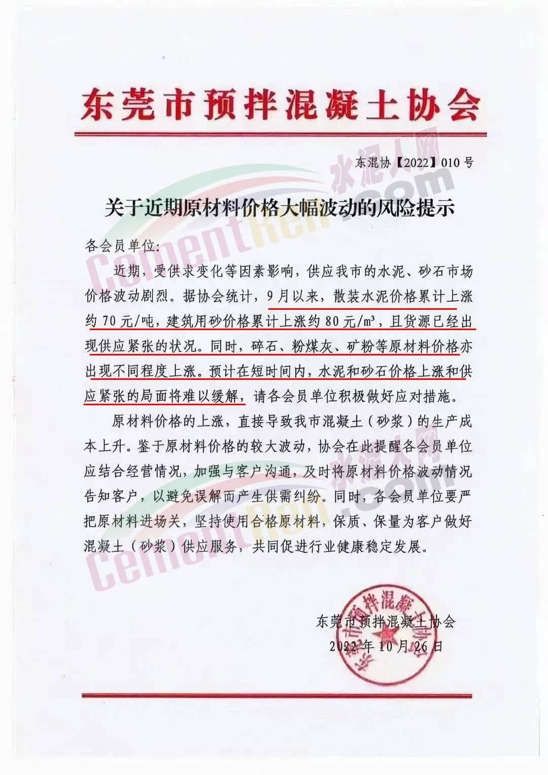 同期,广东东莞市预拌混凝土协会发布《关于近期原材料价格大幅波动的风险提示》称近期,受供求变化等因素影响,供应东莞市的水泥、砂石市场价格波动剧烈。