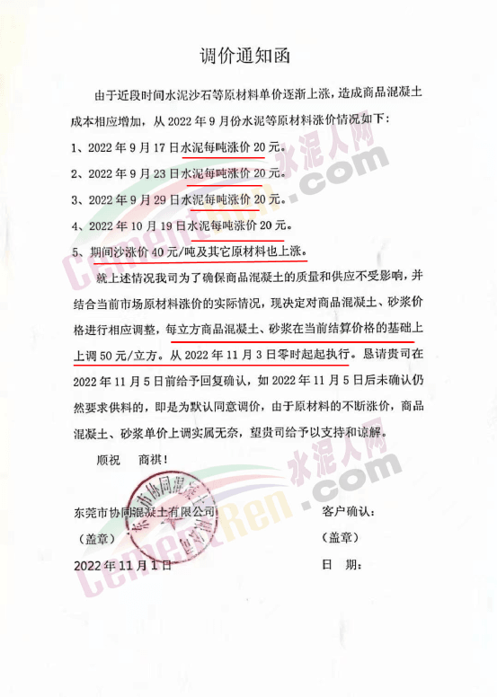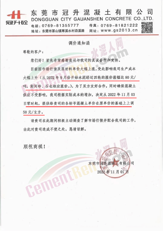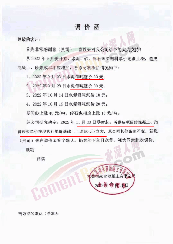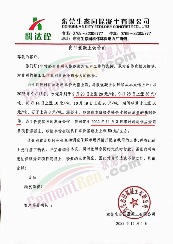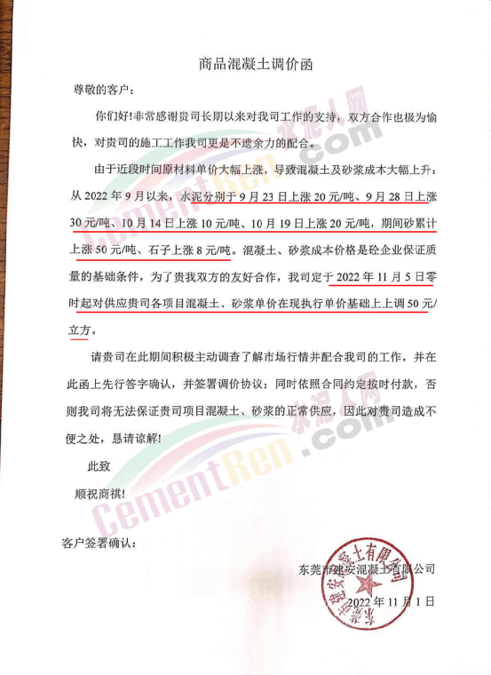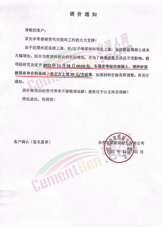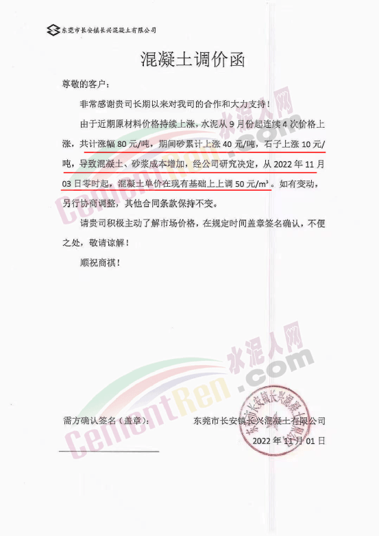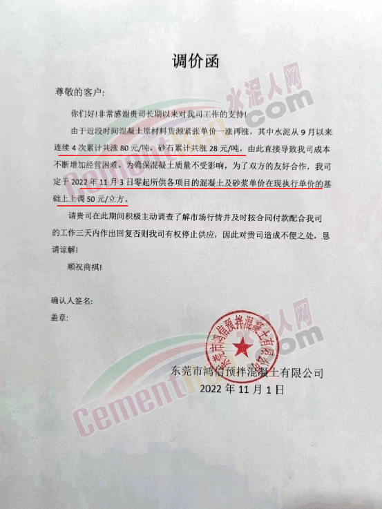企业调价通知称,从9月份开始,水泥、砂石等原材料上涨,造成混凝土企业生产成本增加,其中水泥4轮连涨,累计上涨80元/吨,砂上涨40-50元/吨,碎石上涨8-10元/吨。混凝土企业所供各项目的混凝土、砂浆价格跟进上调50元/吨。