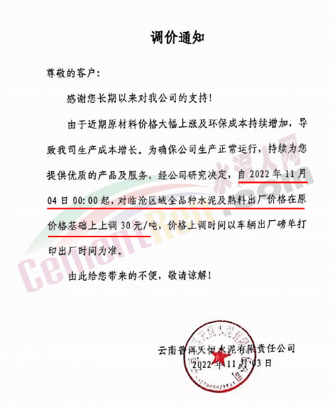 水泥人网消息:云南普洱天恒水泥有限责任公司通知由于近期原材料价格大幅上涨及环保成本持续增加,导致公司生产成本增长。为确保公司生产正常运行,经公司研究决定,自2022年11月4日0时起,对临沧区域全品种水泥及熟料出厂价格在原价格基础上上调30元/吨,价格上调时间以车辆出厂磅单打印出厂时间为准。