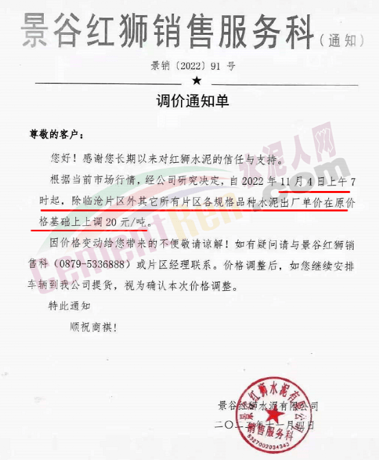 长宁红狮销售服务科通知,根据当前市场行情,经公司研究决定,自2022年11月4日上午7 时起,各品牌规格水泥价格在原基础上上调30元/吨。