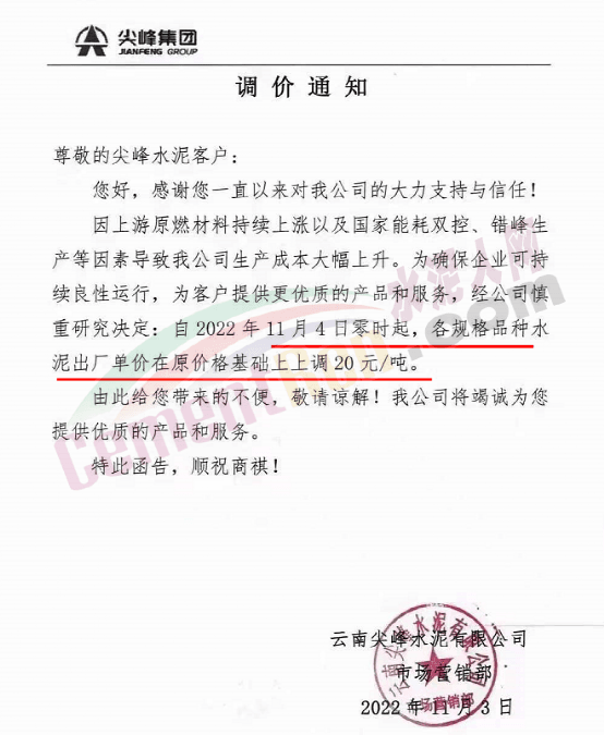 11月3日云南尖峰水泥有限公司市场营销部通知,因上游原燃材料持续上涨以及国家能耗双控、错峰生产等因素导致公司生产成本大幅上升。为确保企业可持续良性运行,为客户提供更优质的产品和服务,经公司慎重研究决定自2022年11月4日零时起,各规格品种水泥出厂单价在原价格基础上上调20元/吨。