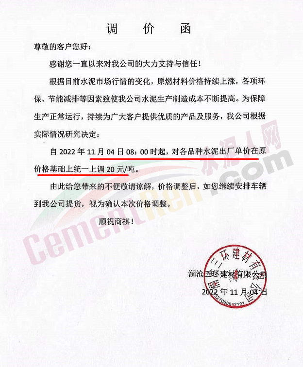 云南澜沧三环建材有限公司通知,根据目前水泥市场行情的变化,原燃材料价格持续上涨,各项环保、节能减排等因素致使公司水泥生产制造成本不断提高。公司根据实际情况研究决定自11月4日8时起,对各品种水泥出厂价在原价基础上统一上调20元/吨。