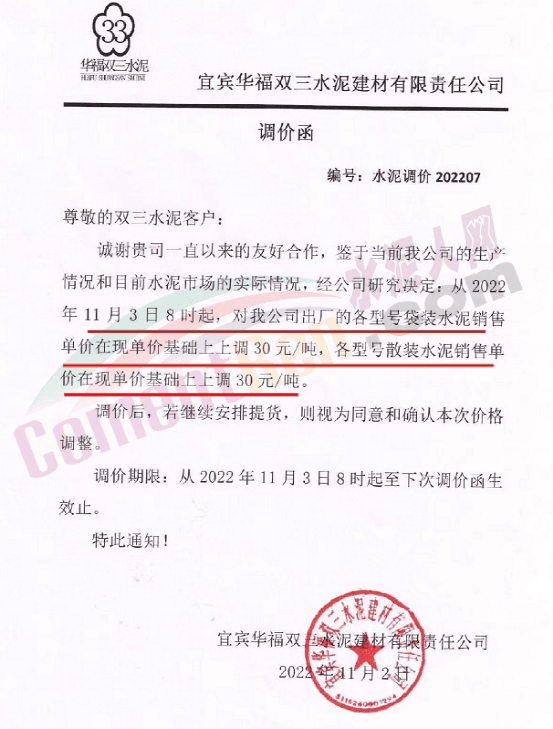 宜兴实业有限公司通知,根据当前市场变化和公司的生产实际情况,经公司研究决定自2022年11月3日0时起,所有区域袋、散装品种水泥出厂价在原价格基础上上调30元/吨。