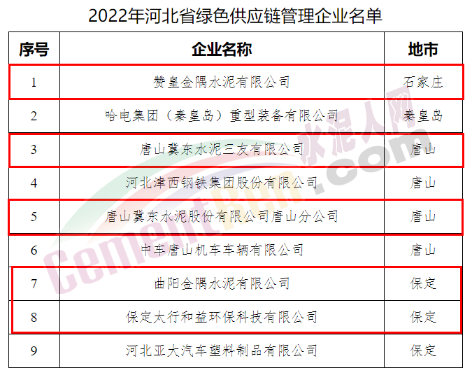 2022年河北省绿色供应链管理企业名单中包含赞皇金隅水泥有限公司、唐山冀东水泥三友有限公司、唐山冀东水泥股份有限公司唐山分公司、曲阳金隅水泥有限公司、保定太行和益环保科技有限公司等5家水泥企业。