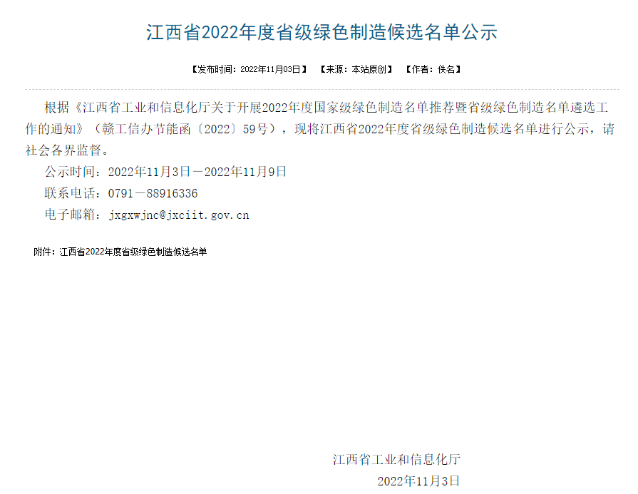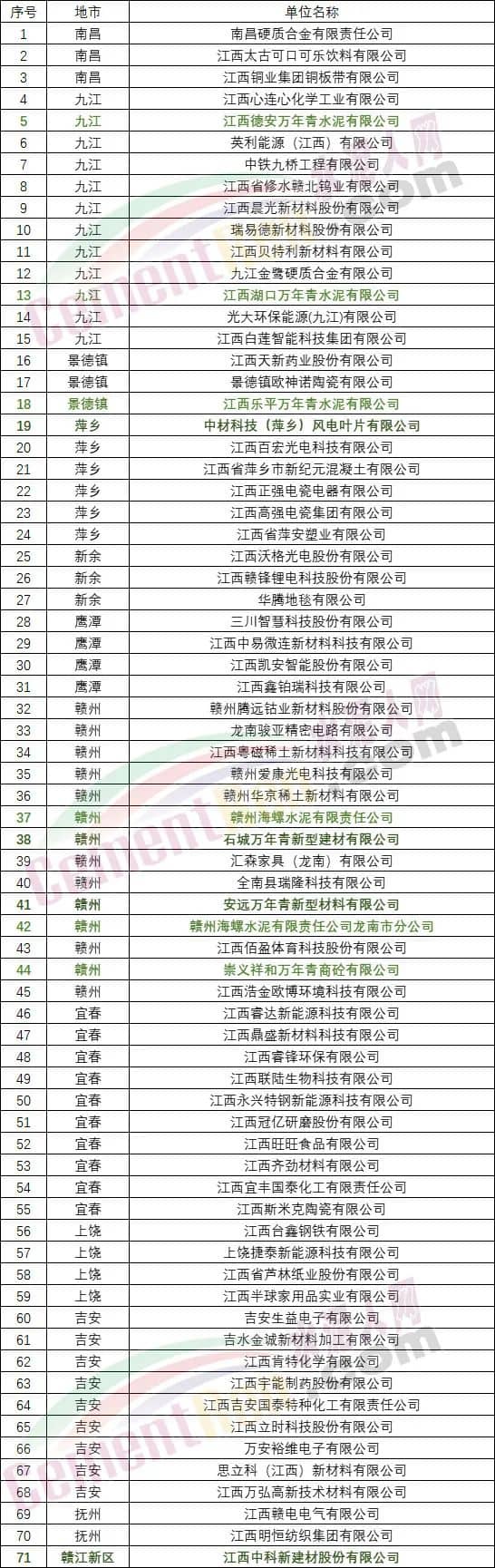 11月3日,江西省工信厅公布《2022年度省级绿色制造候选名单》71家绿色工厂名单中包括江西德安万年青水泥有限公司、江西湖口万年青水泥有限公司、江西乐平万年青水泥有限公司、赣州海螺水泥有限责任公司、赣州海螺水泥有限责任公司龙南市分公司等5家水泥企业。