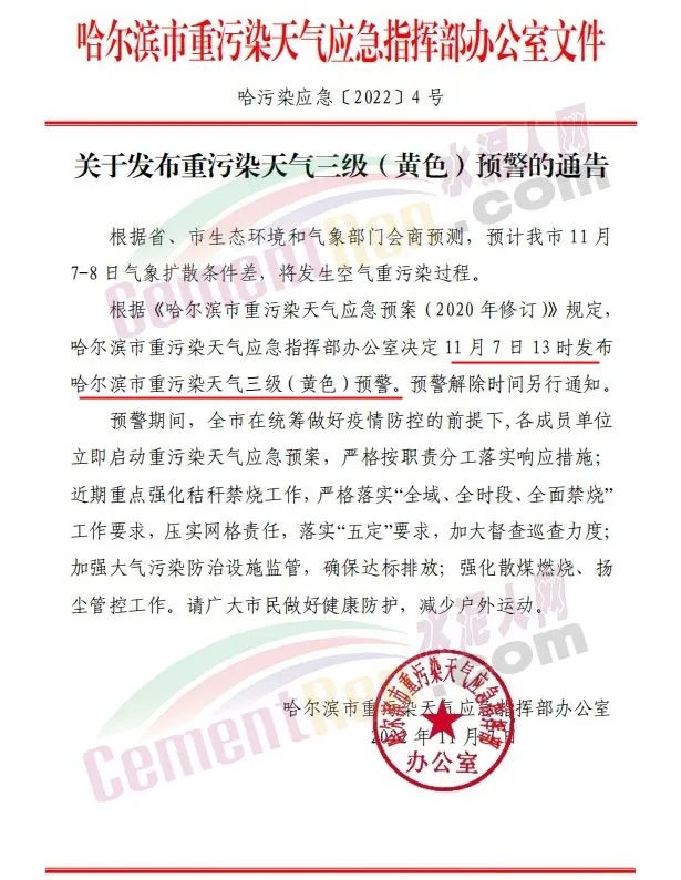 黑龙江哈尔滨启动重污染天气三级(黄色)预警