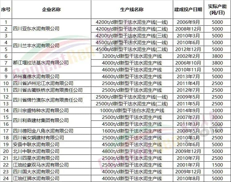据水泥人网不完全统计,上述区域涉及四川、安徽、河北、黑龙江区域40多家水泥企业64条熟料生产线。