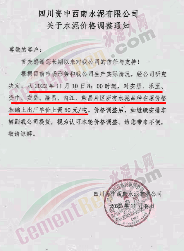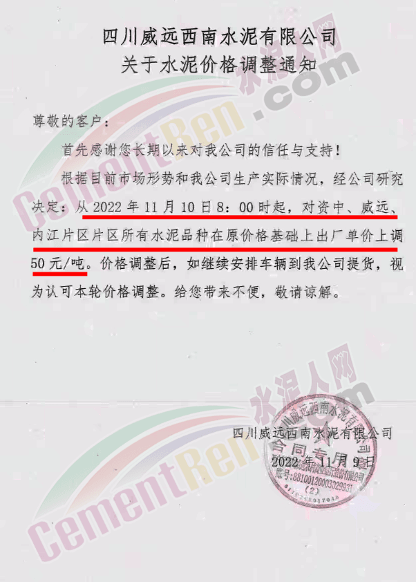 四川威远西南水泥通知,11月10日8时起,对资中、威远、内江片区所有水泥品种出厂价上调50元/吨。