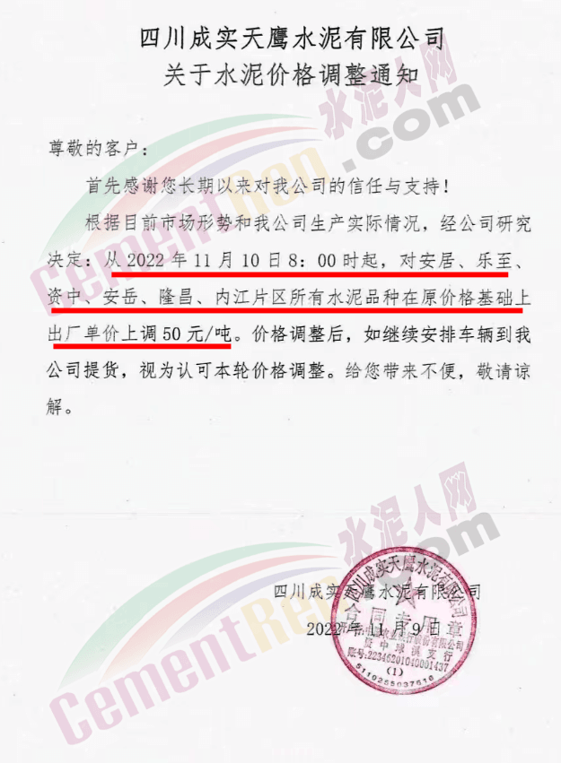四川成实天鹰水泥有限公司通知,从11月10日8时起,对安居、乐至、资中、安岳、隆昌、内江片区所有水泥品种出厂价上调50元/吨。