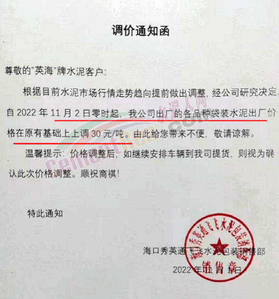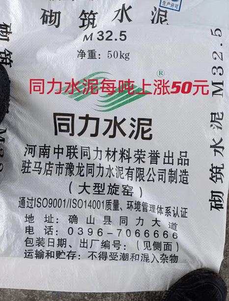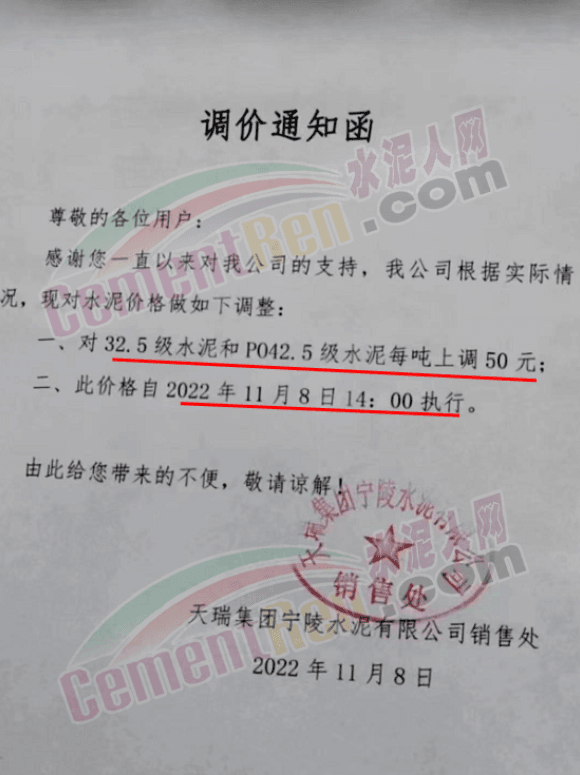 河南天瑞集团宁陵水泥有限公司销售处通知,自11月8日14时起对32.5级水泥和P.O42.5级水泥上调50元/吨。