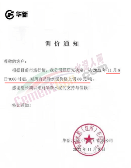 华新水泥(红河)有限公司通知,11月8日0时起,对所有品种水泥价格上调60元/吨。