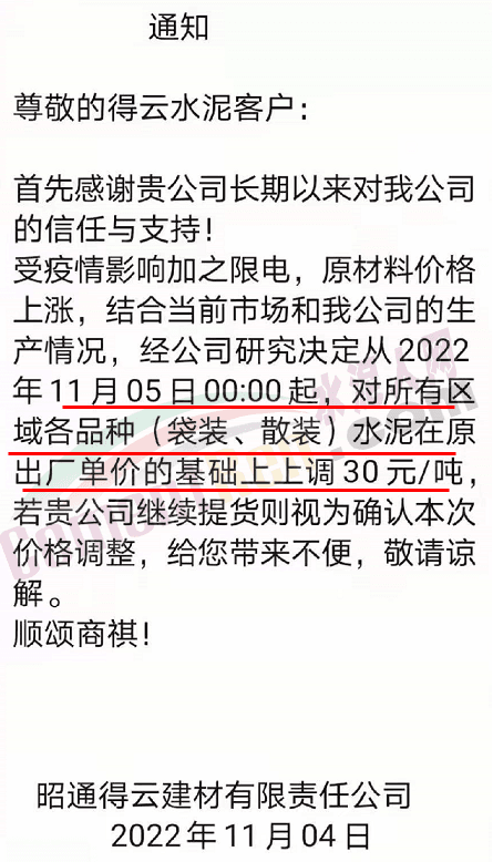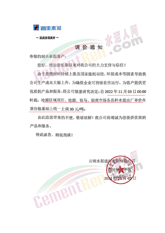 云南水泥建材集团有限公司临沧销售中心通知,由于原燃材料持续上涨及国家能耗双控,环保成本等因素导致公司生产成本大幅上升,为确保企业可持续良性运行,为客户提供更优质的产品和服务,经公司慎重研究决定,自2022年11月3日0时起,沧源区域双江、沧源、耿马、勐南市场各品种水泥出厂单价在原价格基础上统一上调30元/吨。