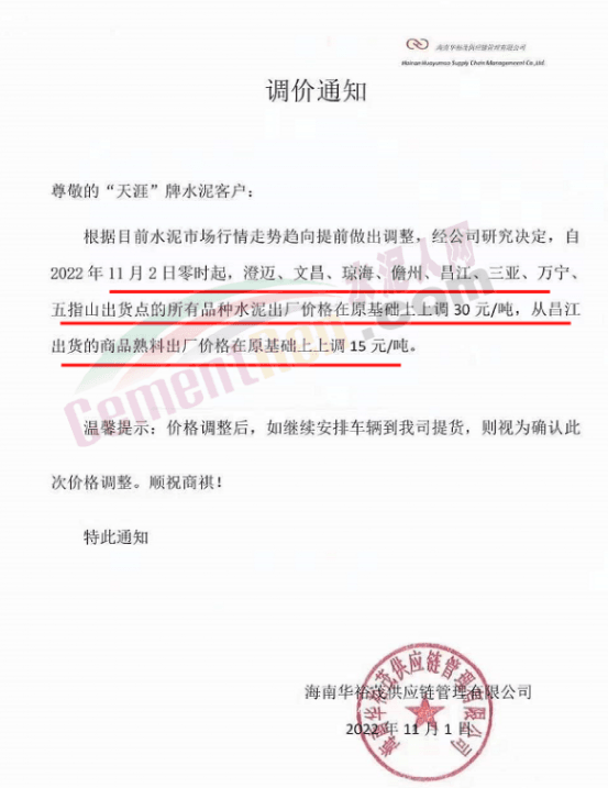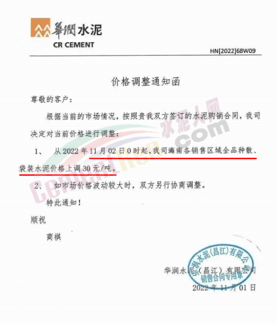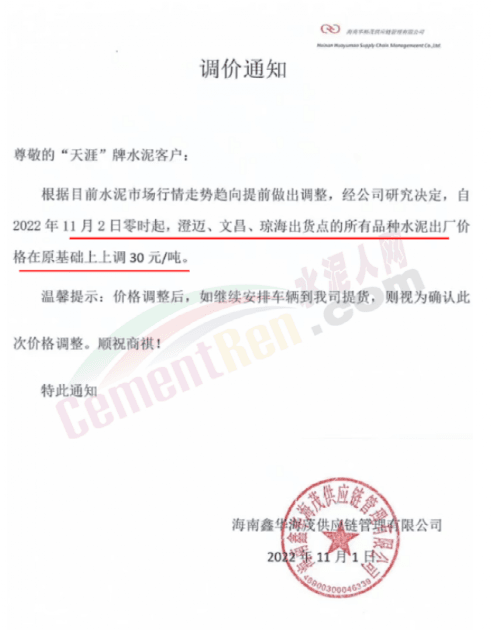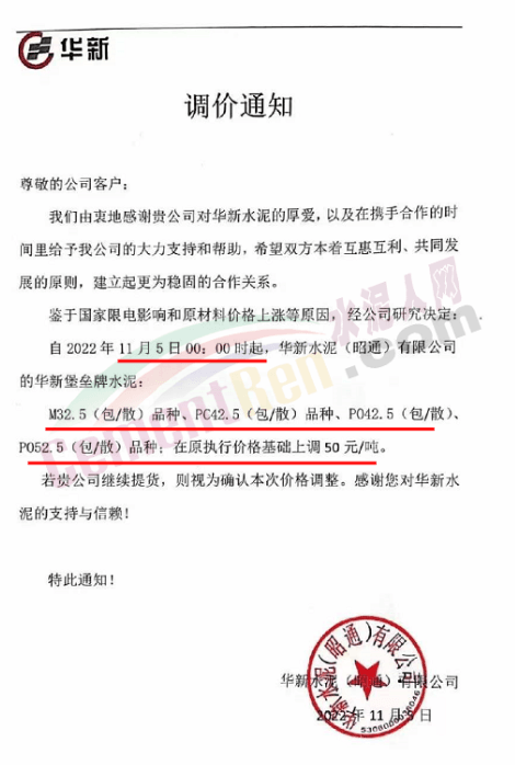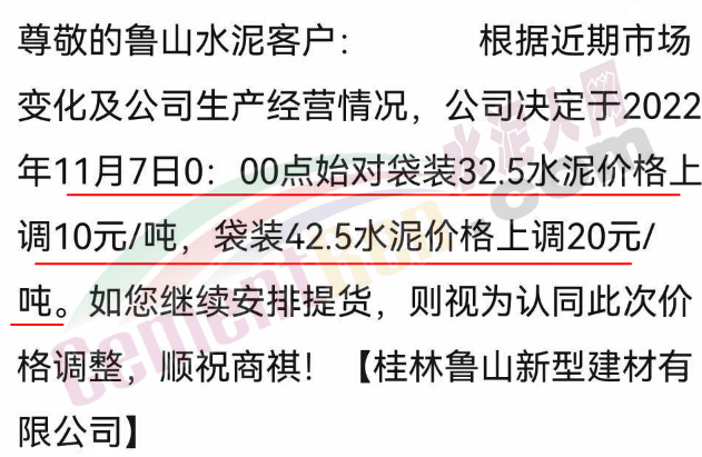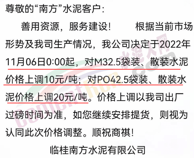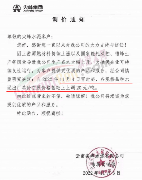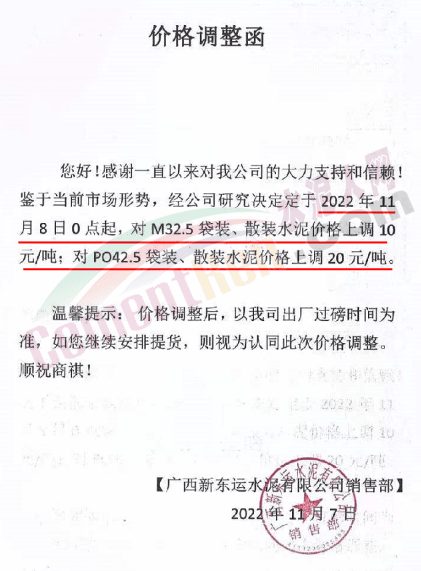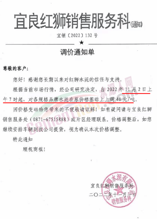11月2日-3日昆明、楚雄地区通知上调水泥价格20-40元/吨;宜良红狮销售服务科通知,根据当前市场行情,经公司研究决定,自2022年11月2日上午7时起,对各规格品牌水泥在原价格基础上上调40元/吨。