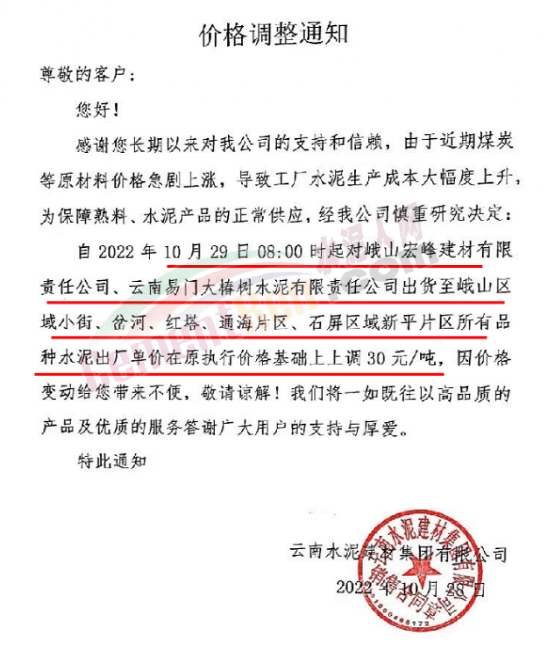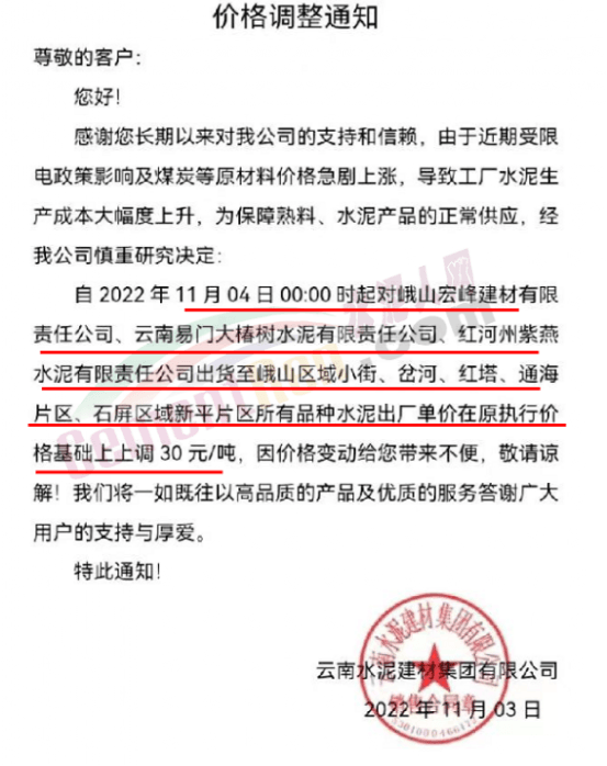 云南水泥建材集团有限公司通知,由于近期受限电政策影响及煤炭等原材料价格急剧上涨,导致工厂水泥生产成本大幅度上升,为保障熟料、水泥产品的正常供应,经公司慎重研究决定,自2022年11月04日0时起对峨山宏峰建材有限责任公司、云南易门大椿树水泥有限责任公司、红河州紫燕水泥有限责任公司出货至峨山区域小街、岔河、红塔、通海片区、石屏区域新平片区所有品种水泥出厂单价在原执行价格基础上上调30元/吨。企业曾于10月底上调水泥价格30元/吨,两次累计上调60元/吨。
