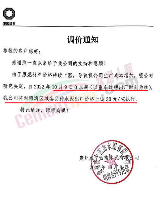 贵州威宁西南水泥有限公司调价通知称,由于原燃材料价格持续上涨,导致公司生产成本增加,经研究决定对昭通区域各品种水泥出厂价格上调30元/吨。