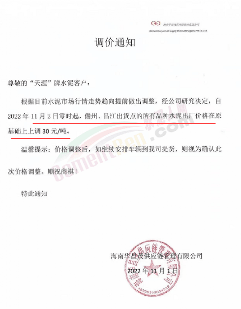 原燃材料价格上涨,企业生产压力较大,加之市场需求略有回升,厂家涨价意愿强烈。为提升盈利,11月2日起海南地区主要品牌企业通知上调水泥价格30元/吨。