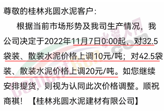 广西桂林主要品牌企业通知11月6-7日起对M32.5袋装、散装水泥价格上调10元/吨对PO42.5袋装、散装水泥价格上调20元/吨。