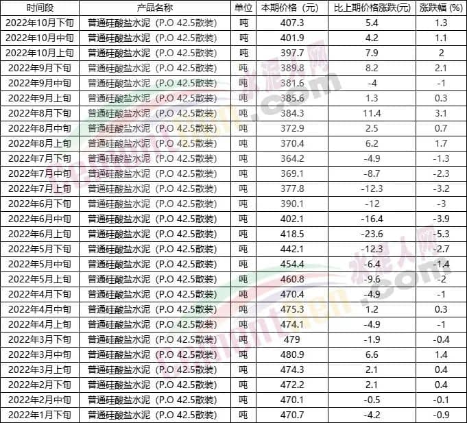据国家统计局公布的流通领域市场价格变动情况10月下旬42.5散装水泥报价407.3元/吨,同比上年同期618.9元/吨仍有211.6元/吨的差距。
