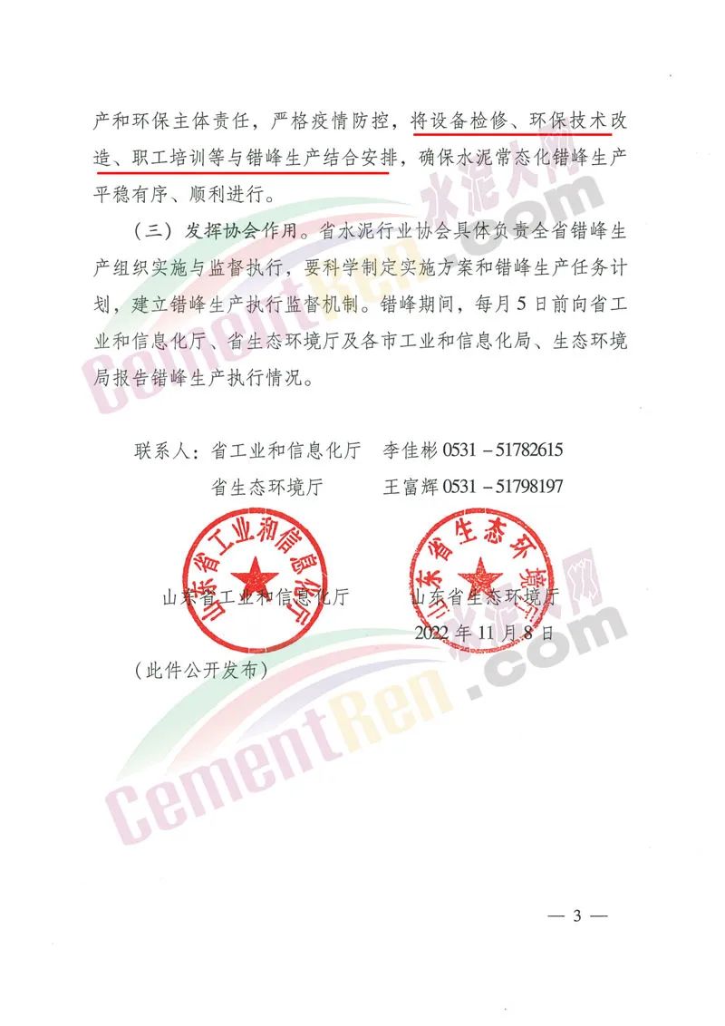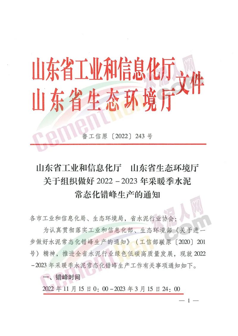 日前,山东省工业和信息化厅、山东省生态环境厅联合印发《关于组织做好2022-2023年采暖季水泥常态化错峰生产的通知》(鲁工信原〔2022]243号)(以下简称《通知》)要求,全省水泥熟料企业的所有熟料生产线(含特种水泥熟料生产线)从2022年11月15日0时至2023年3月15日24时执行今冬明春采暖季常态化错峰生产任务,共计4个月。承担居民供暖任务的生产线、协同处置城市生活垃圾及有毒有害废弃物等任务的生产线,可通过“错峰置换”方式,合理调整错峰时间,在非采暖季补足错峰时间。