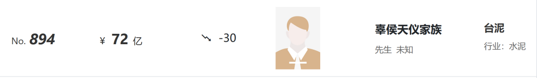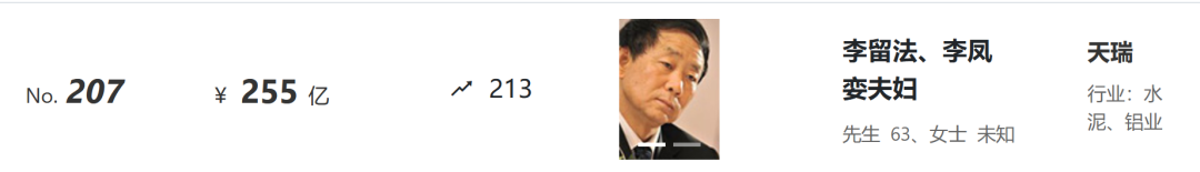 来自浙江的农夫山泉创始人钟睒睒,再次登上2022胡润百富榜榜首,财富值达4550亿元,创20多年来中国首富财富值最高纪录。“水泥富豪天瑞集团的李留法、李凤娈夫妇,以255亿元财富位列207位;红狮控股集团的章小华,以110亿元的财富排名564位;台泥的辜侯天仪家族以72亿元财富位列894位。