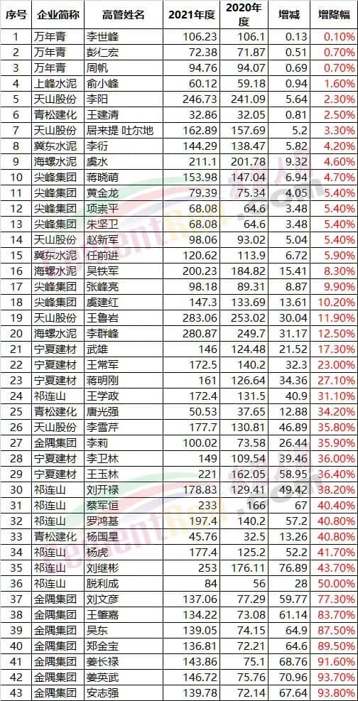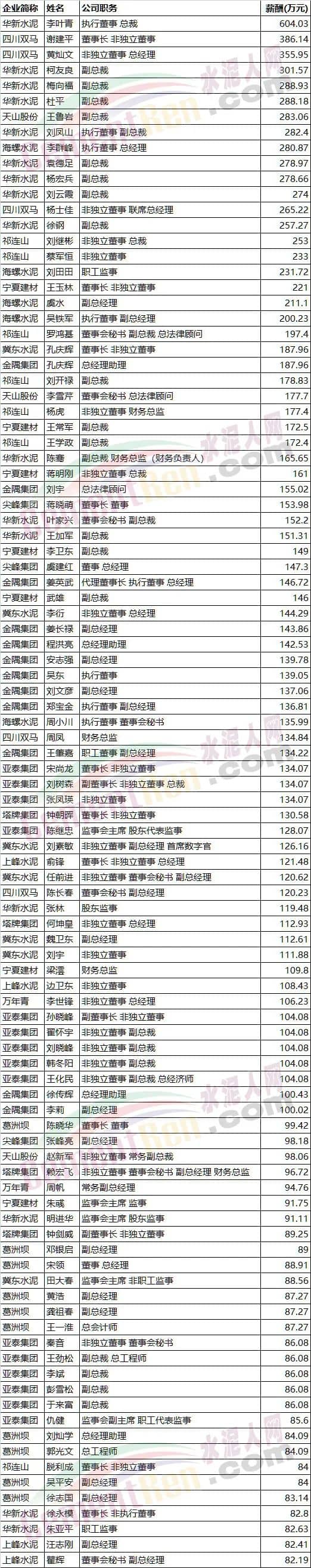 A股水泥板块上市公司高管薪酬前100位