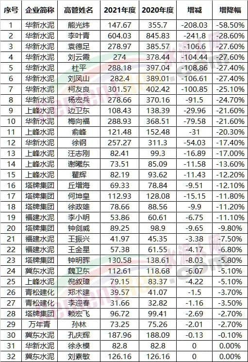 对比2020年,75位水泥上市公司高管中有30位薪酬下降,占比达40%。其中华新水泥副总裁熊光炜薪酬降幅达58.5%,总裁李叶青薪酬降幅为28.6%,降幅前11位高管薪酬降幅均在20%以上。