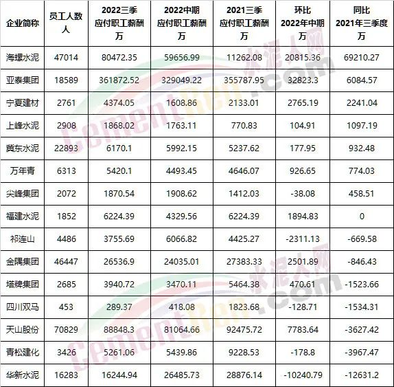 从上市公司三季度未应付职工薪酬可见,天山股份70829名员,2022年三季应付薪酬达88848.3万;海螺水泥47014应付薪酬达80472.35万;金隅集团46447人应付薪酬达26536.9万。