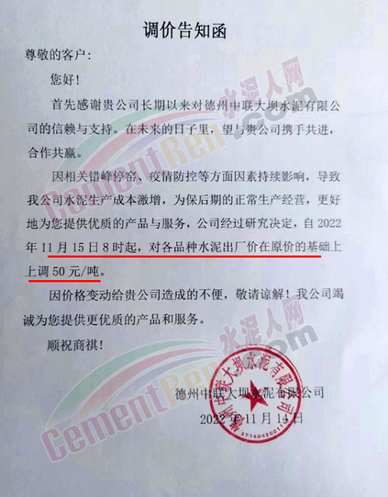 山东区域近来正处于一轮调价过程,区域内主要品牌企业通知上调水泥价格。山东德州大坝中联水泥通知称,因相关错峰停窑、疫情防控等方面因素持续影响,导致公司水泥生产成本激增,为保后期的正常生产经营,经过研究决定,自2022 年11月15日8时起,对各品种水泥出厂价在原价的基础上上调50元/吨。