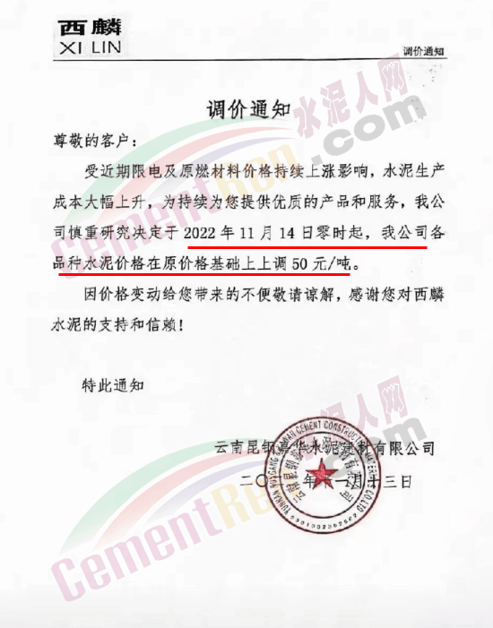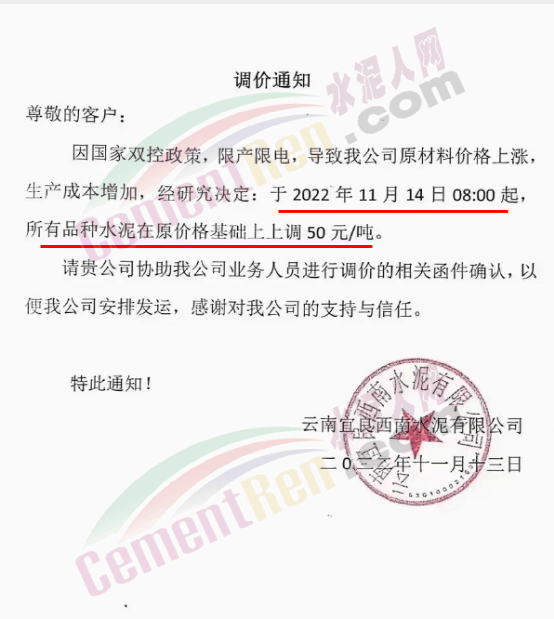 云南宜良西南水泥有限公司通知,因国家双控政策,限产限电,导致公司原材料价格上涨,生产成本增加,经研究决定自11月14日8时起,所有品种水泥价格上调50元/吨。